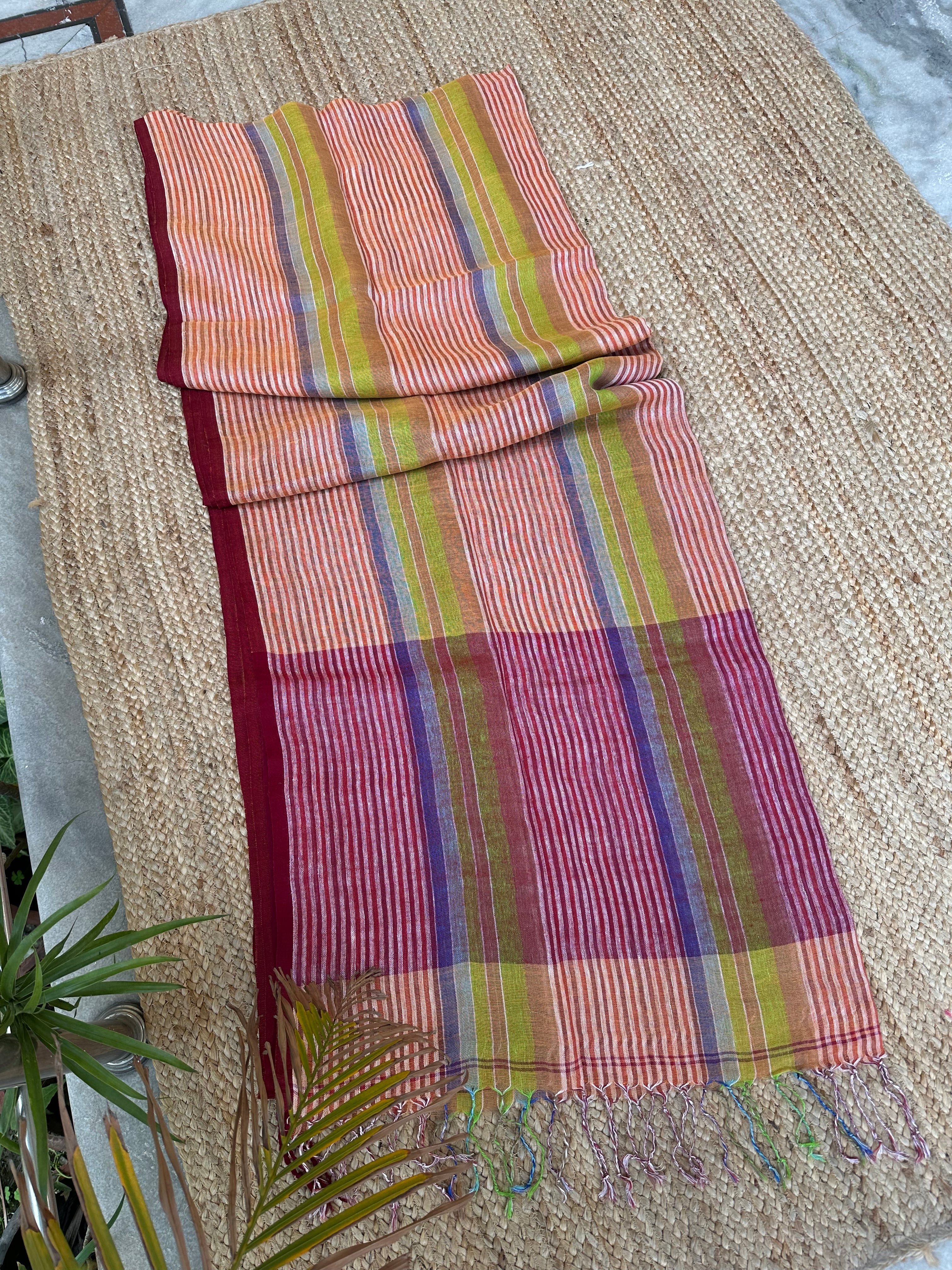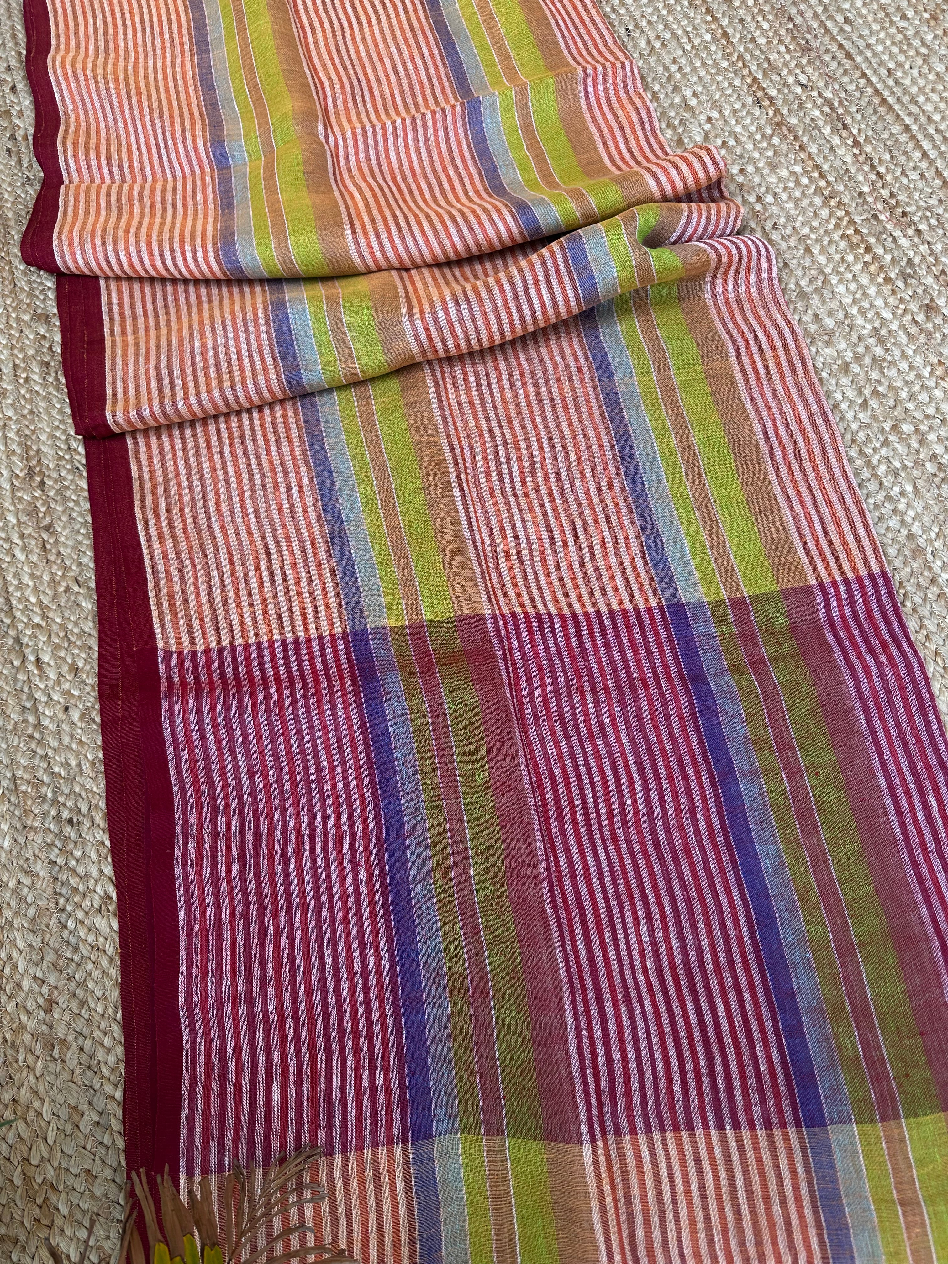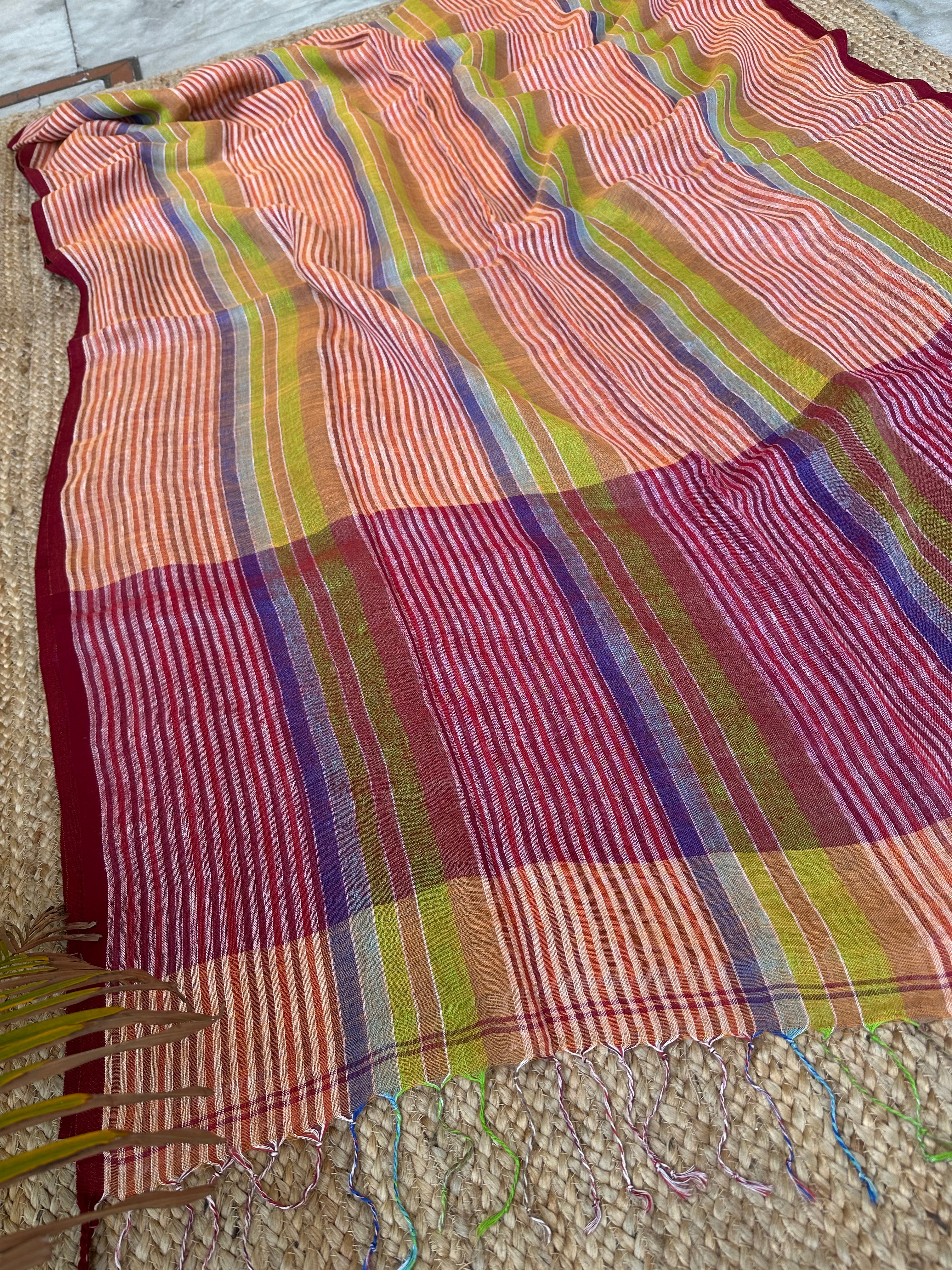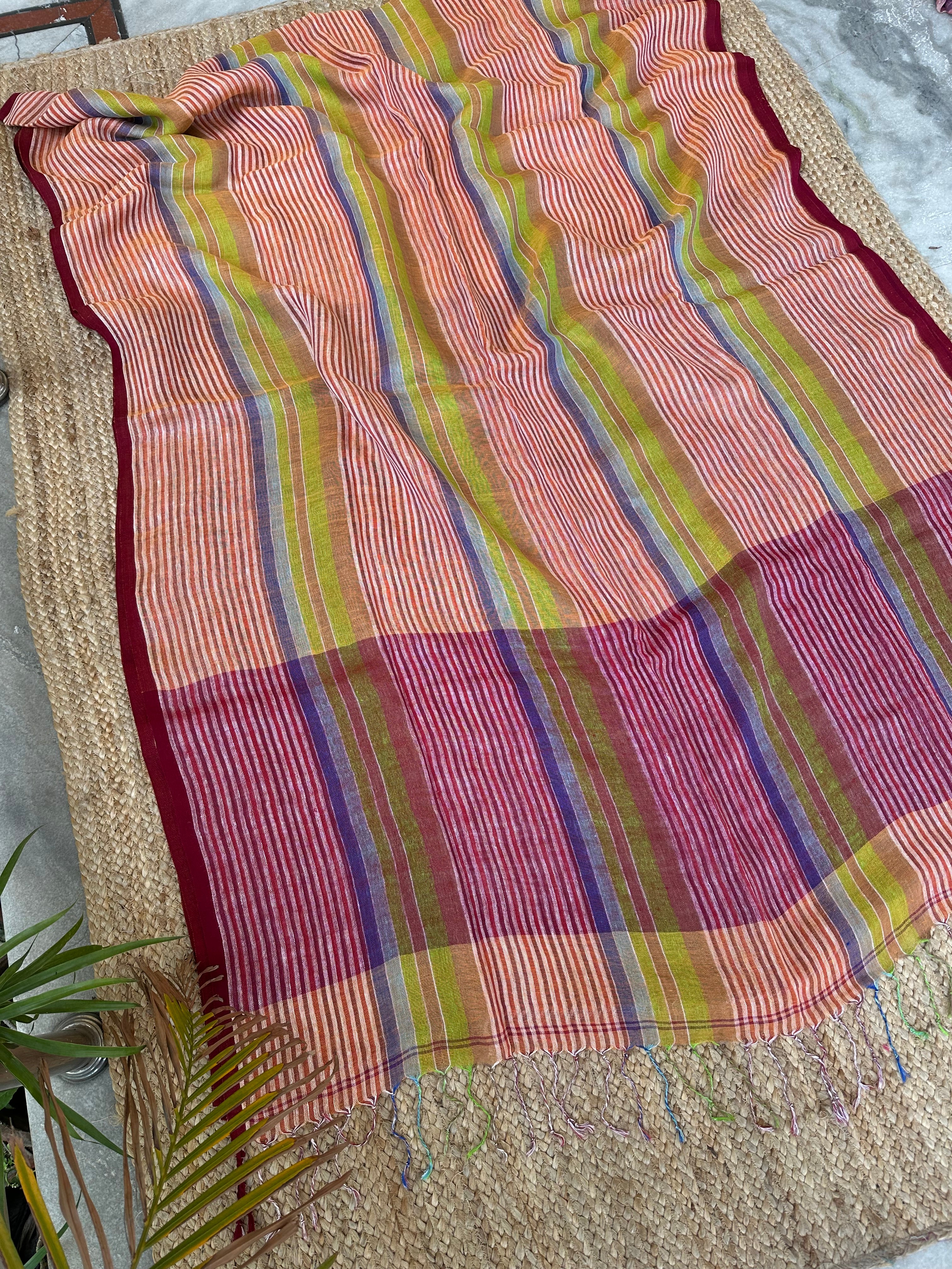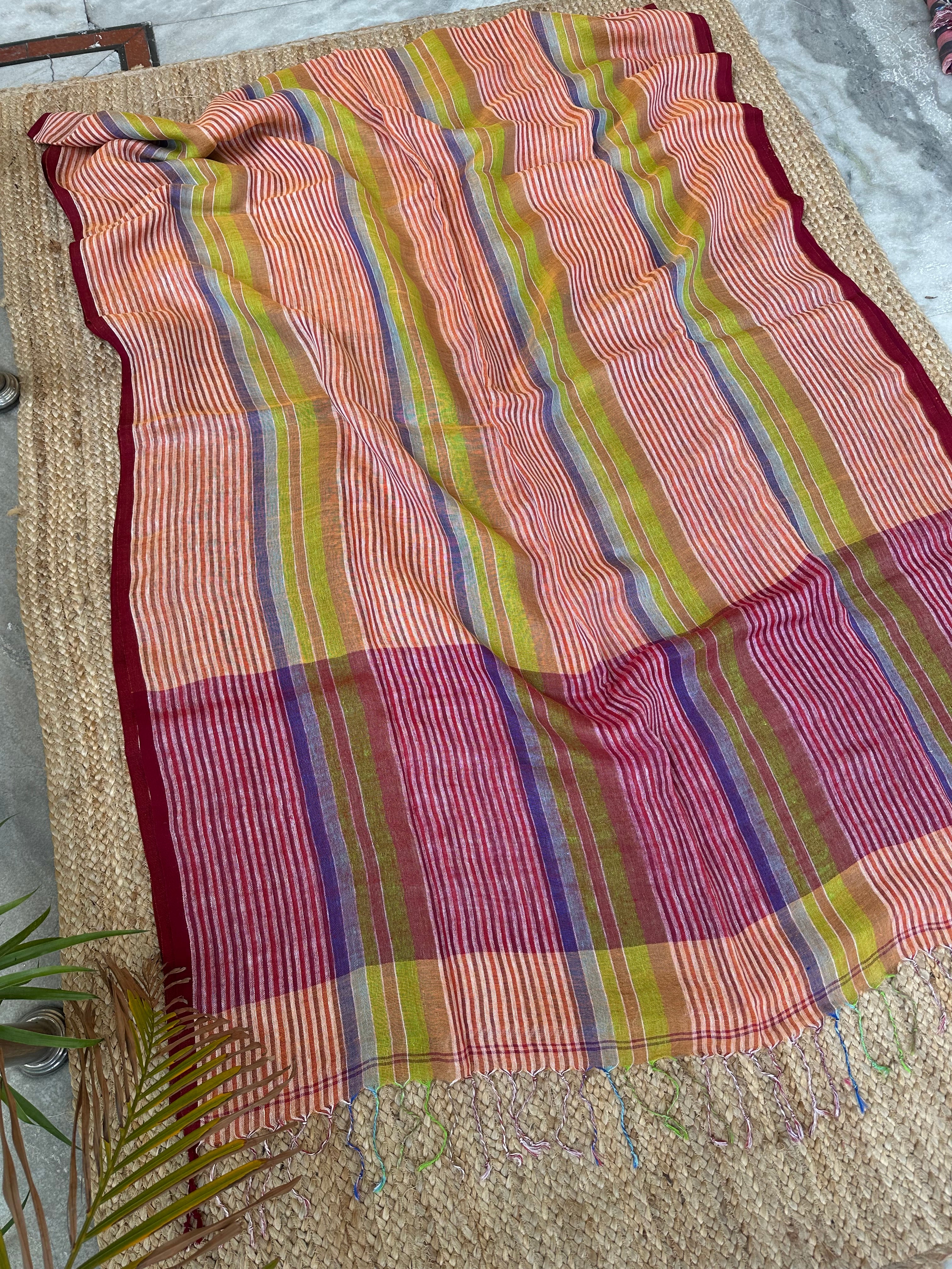 Pure Linen Handloom Maroon Orange Thin striped Saree