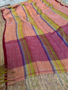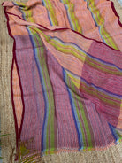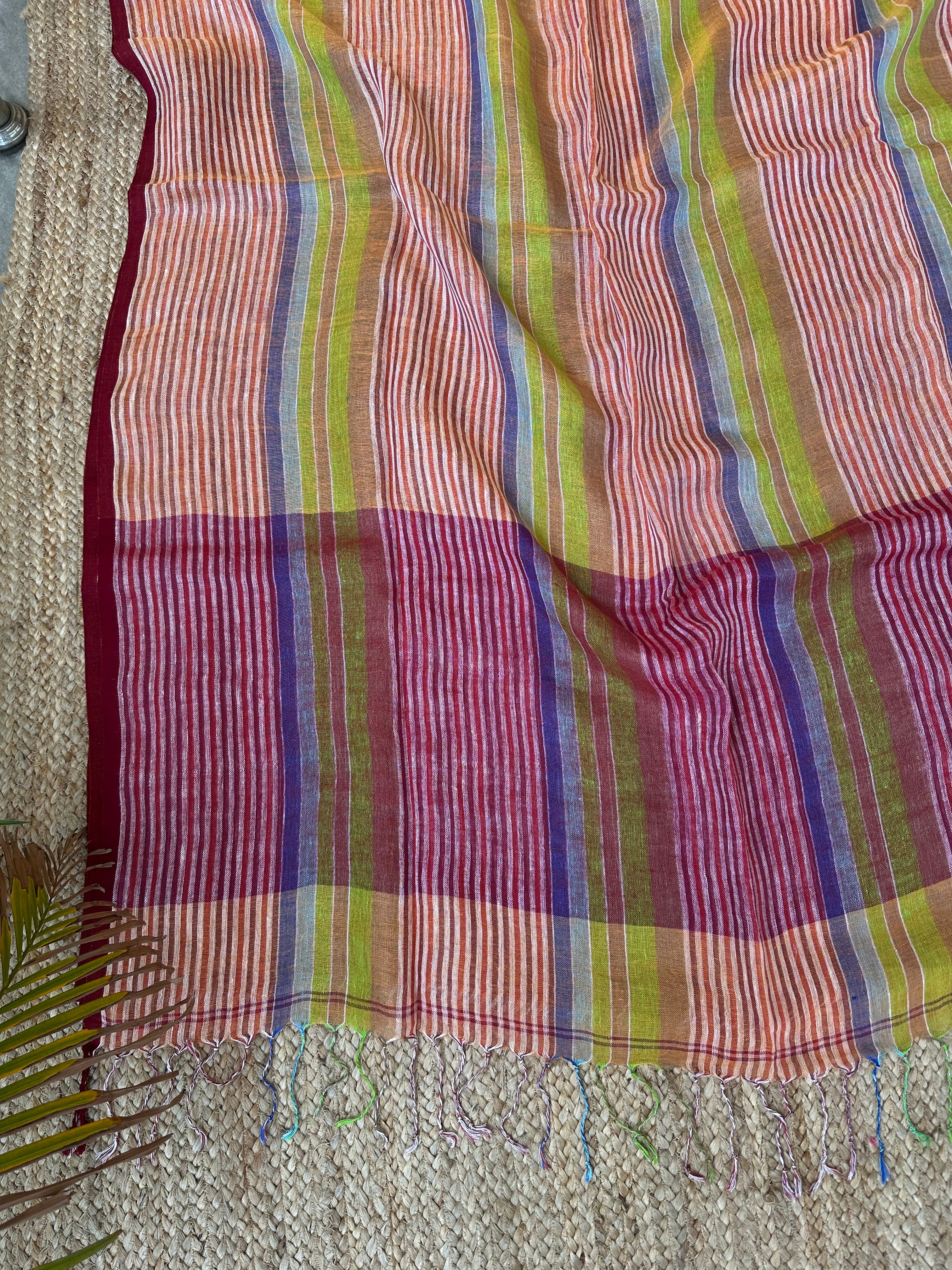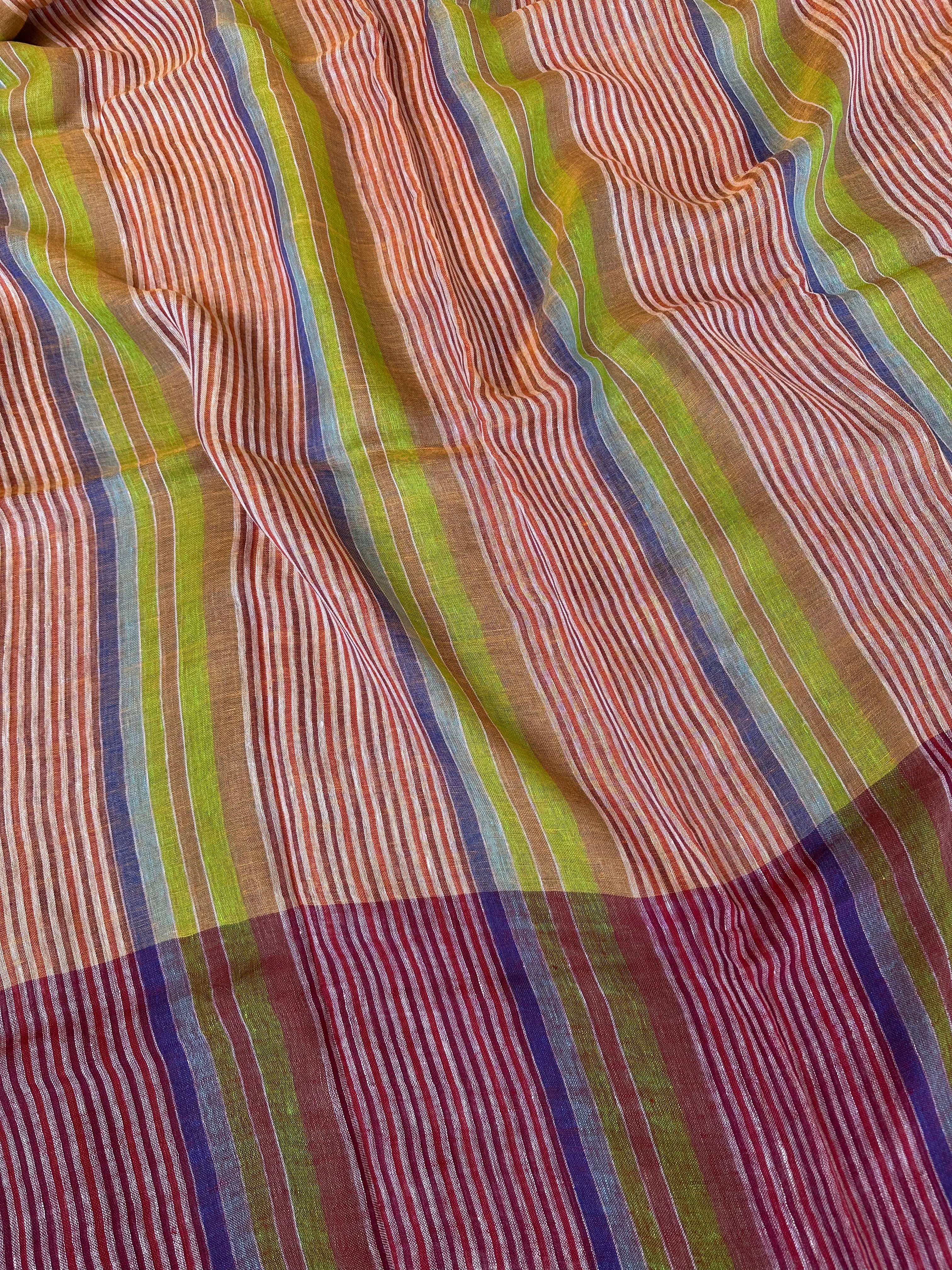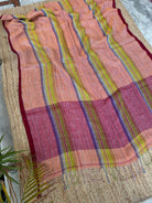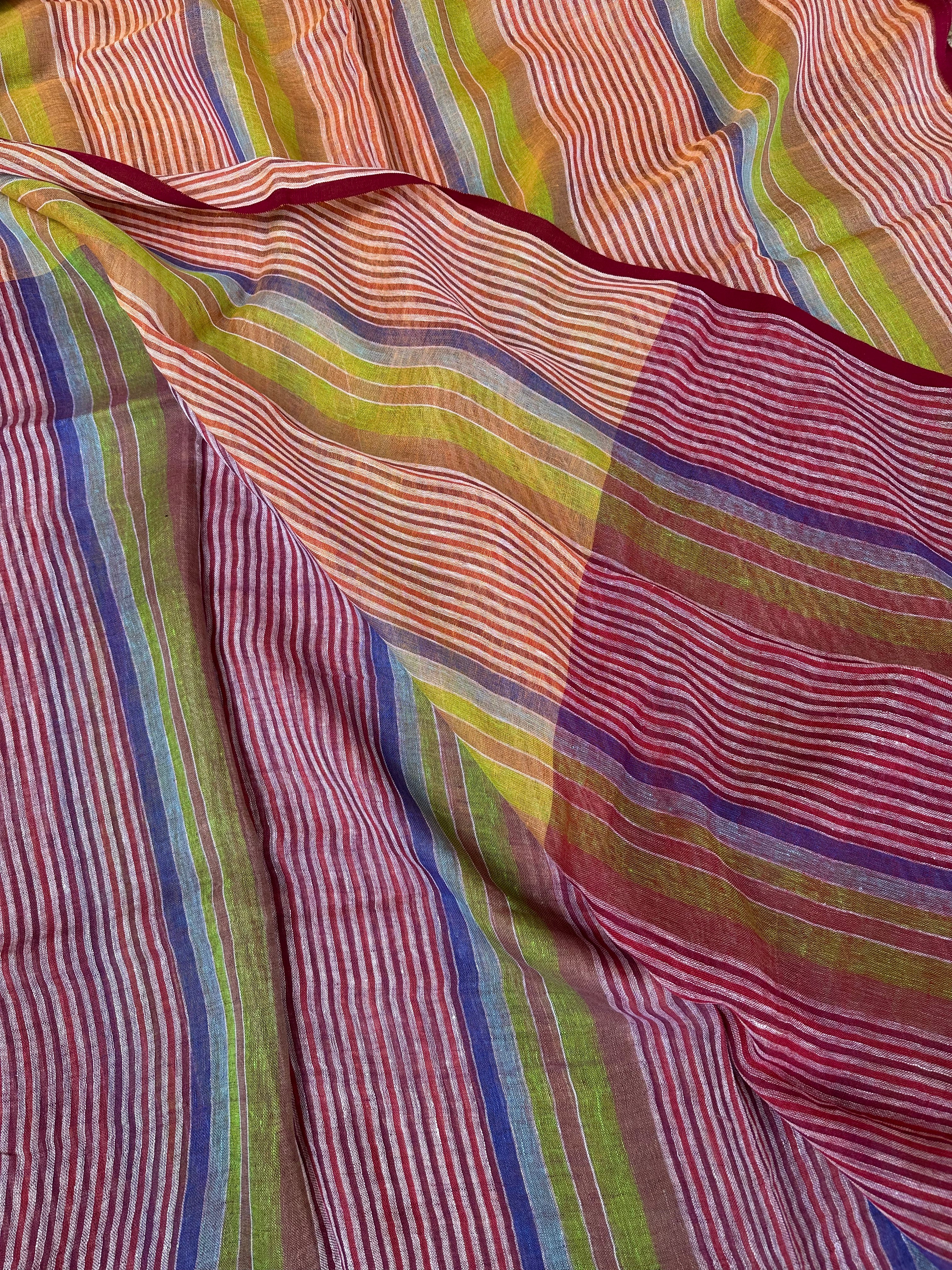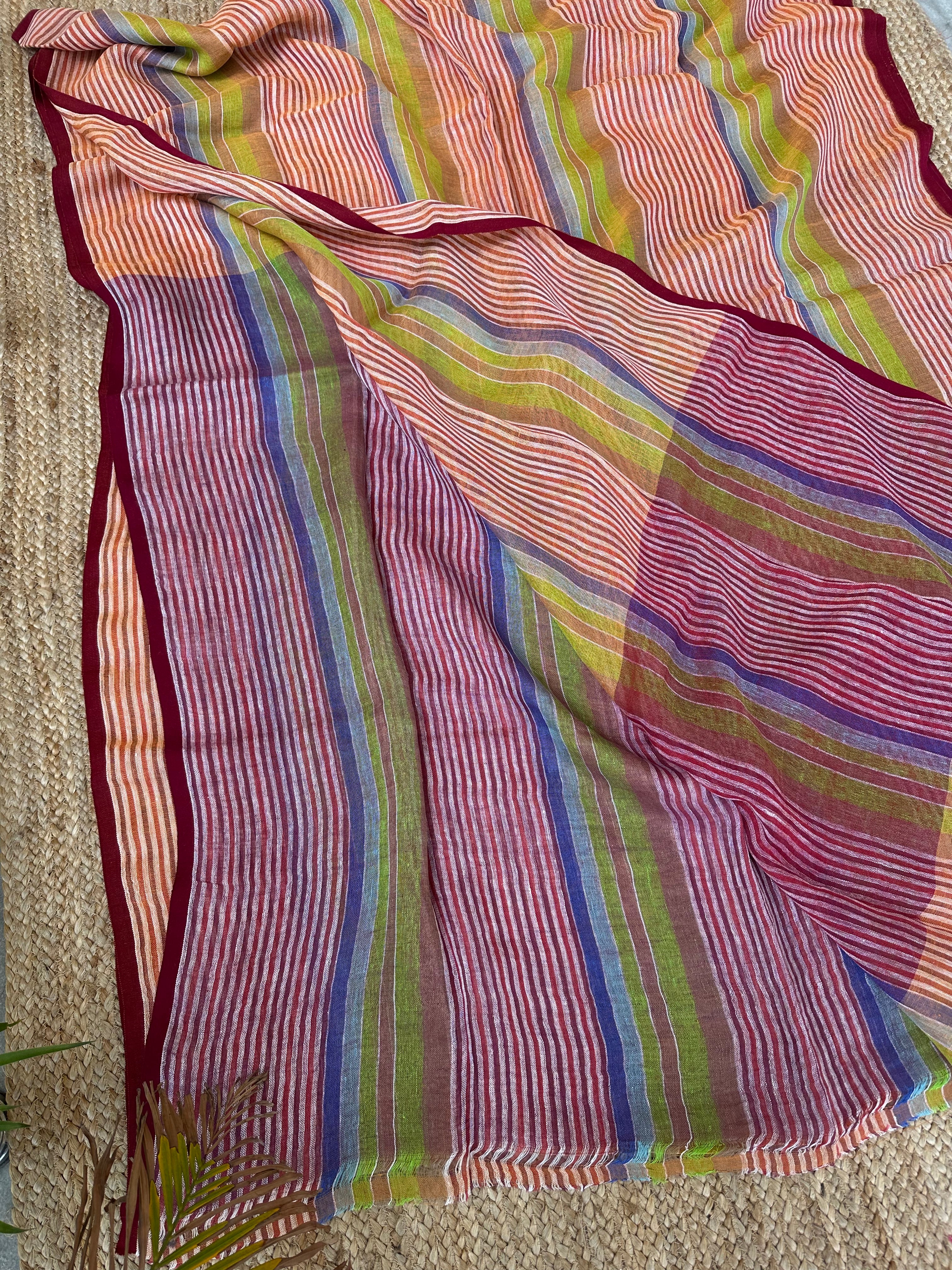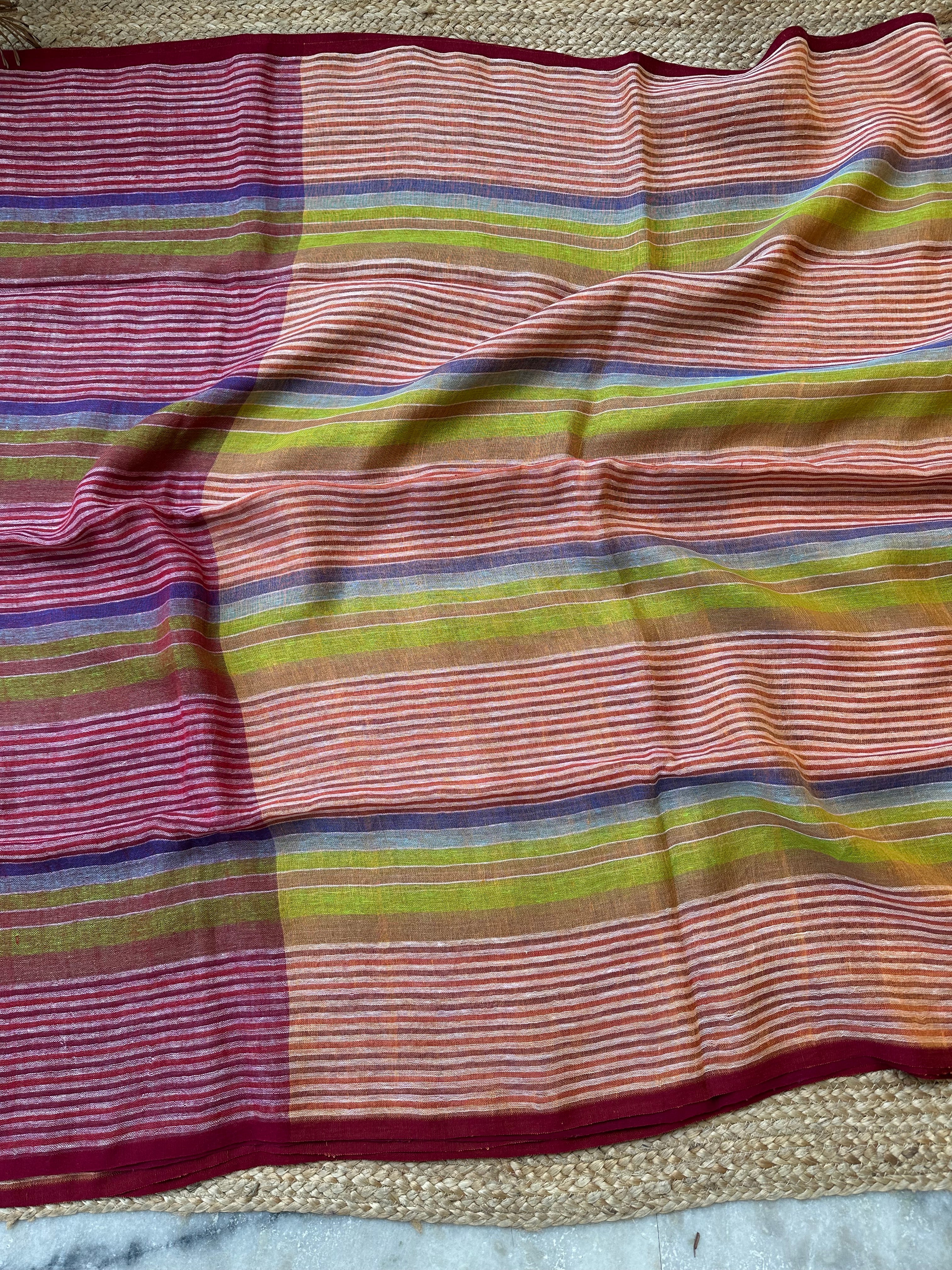 Pure Linen Handloom Maroon Orange Thin striped Saree