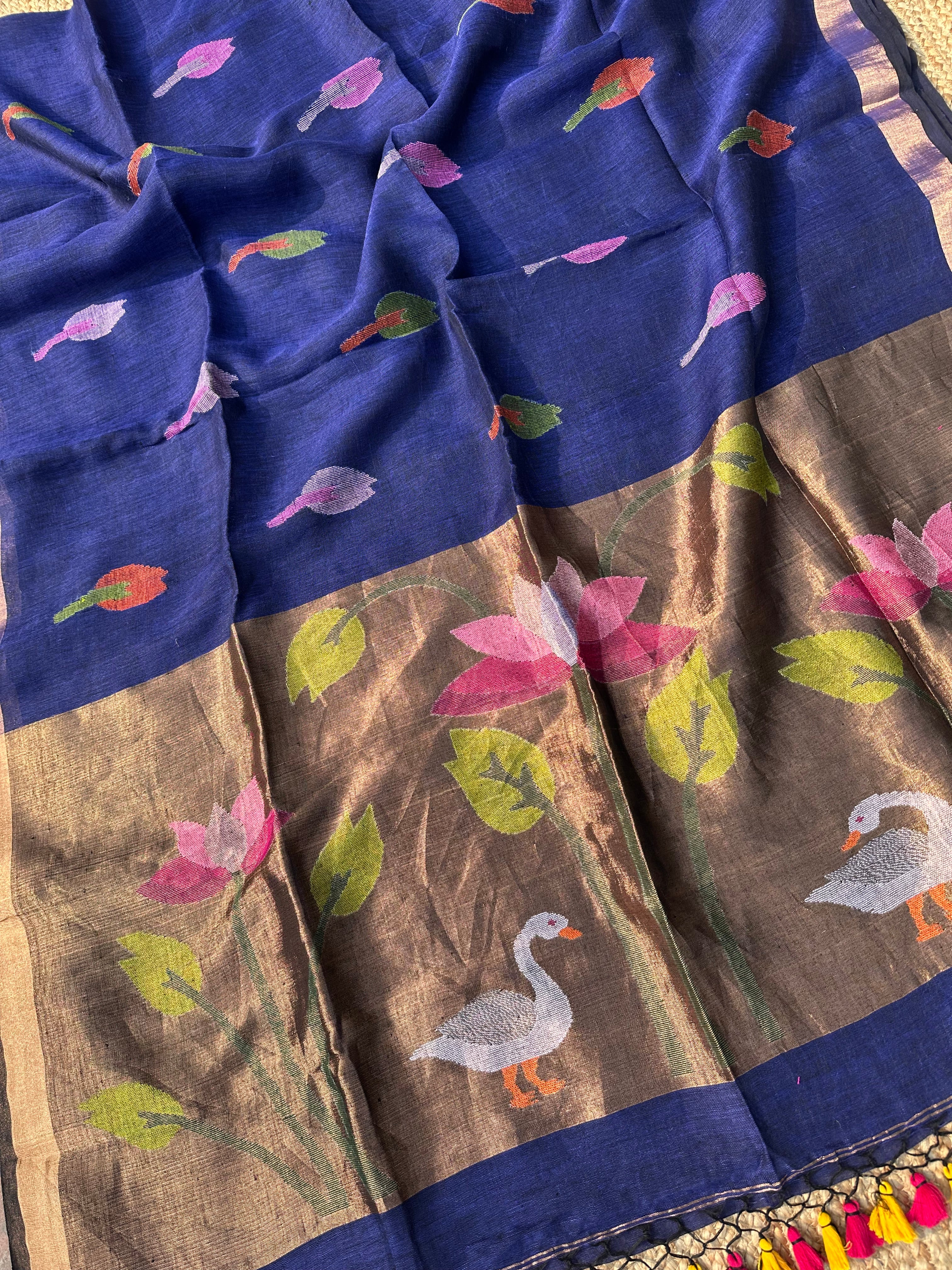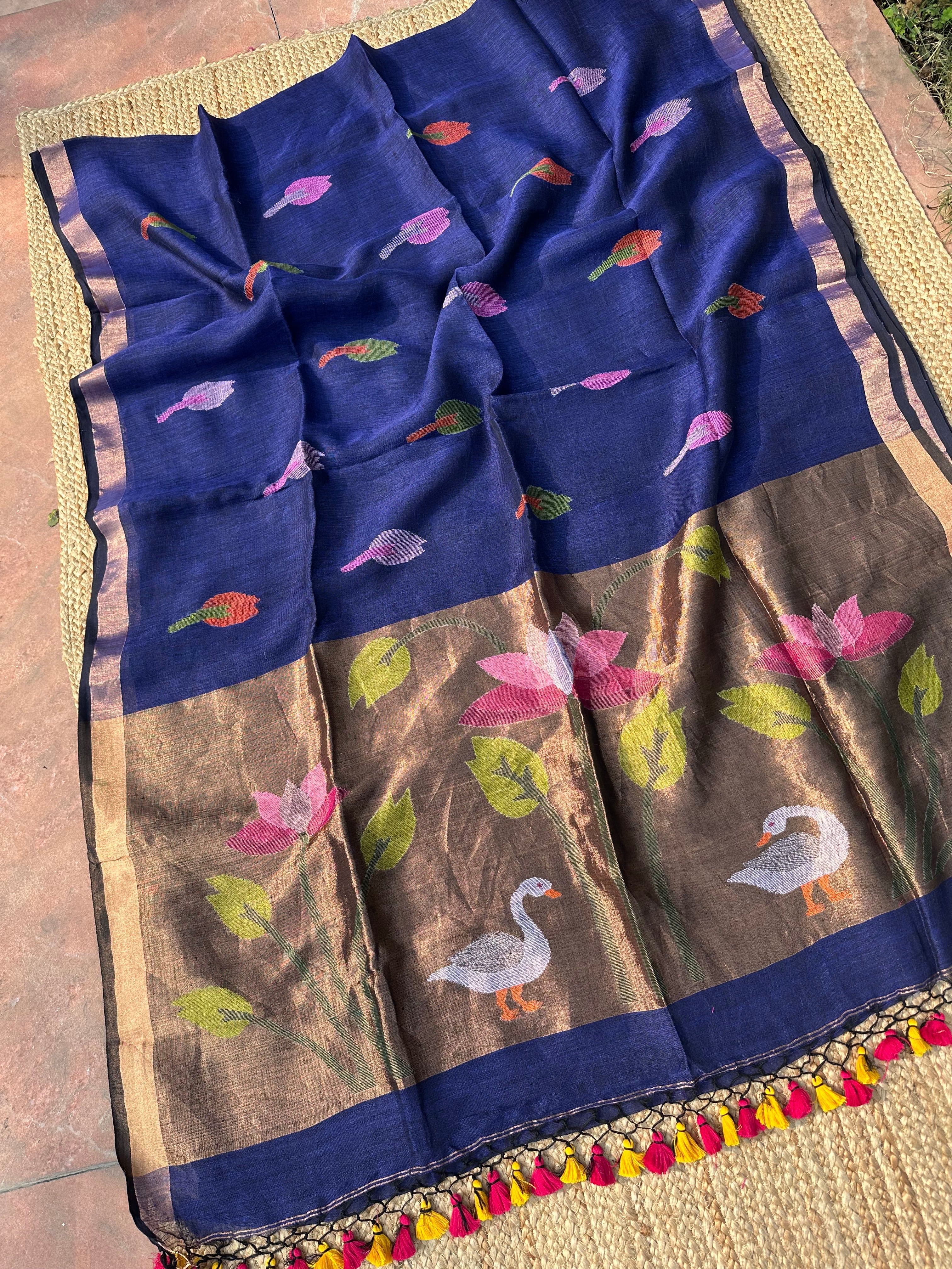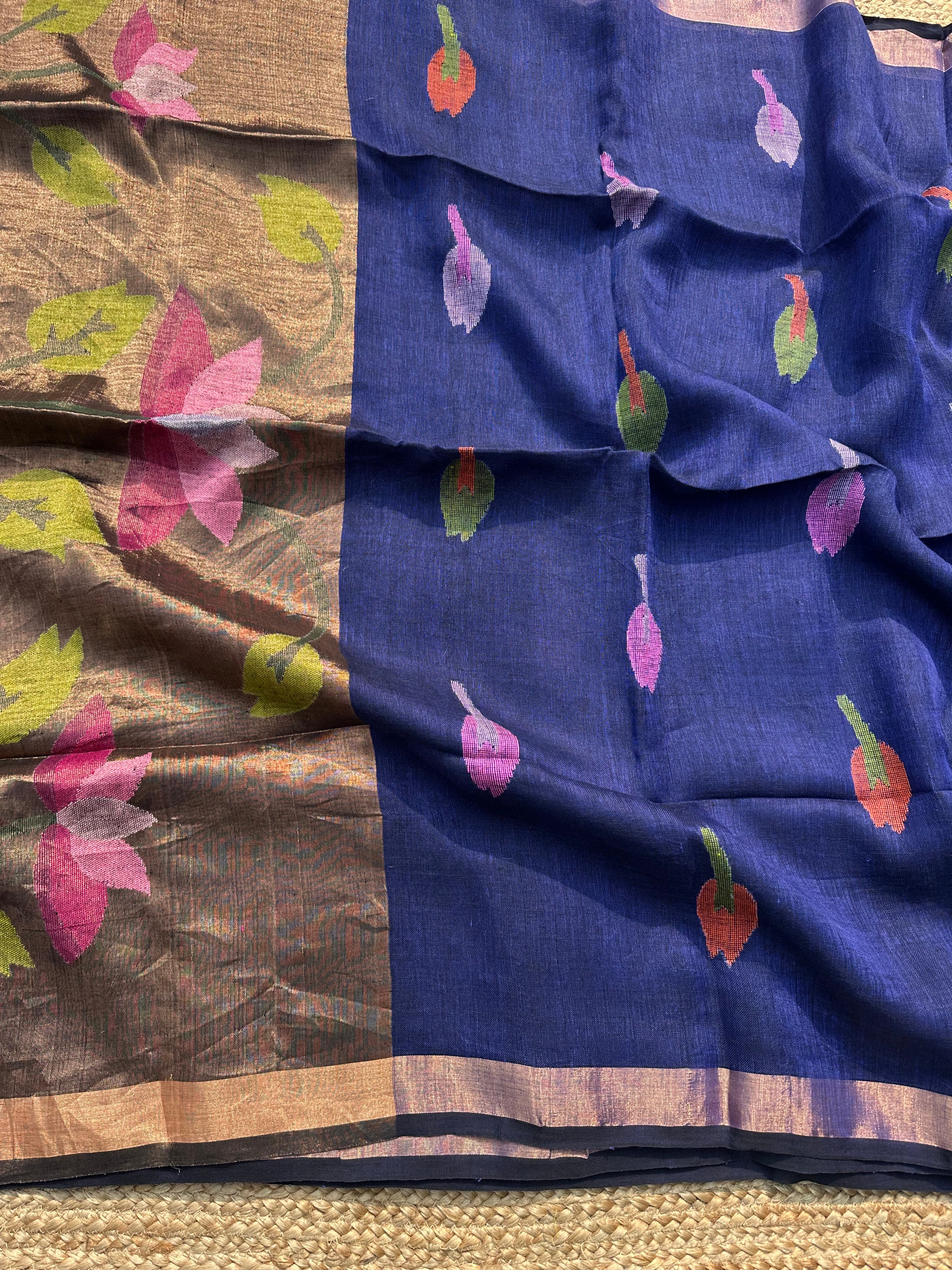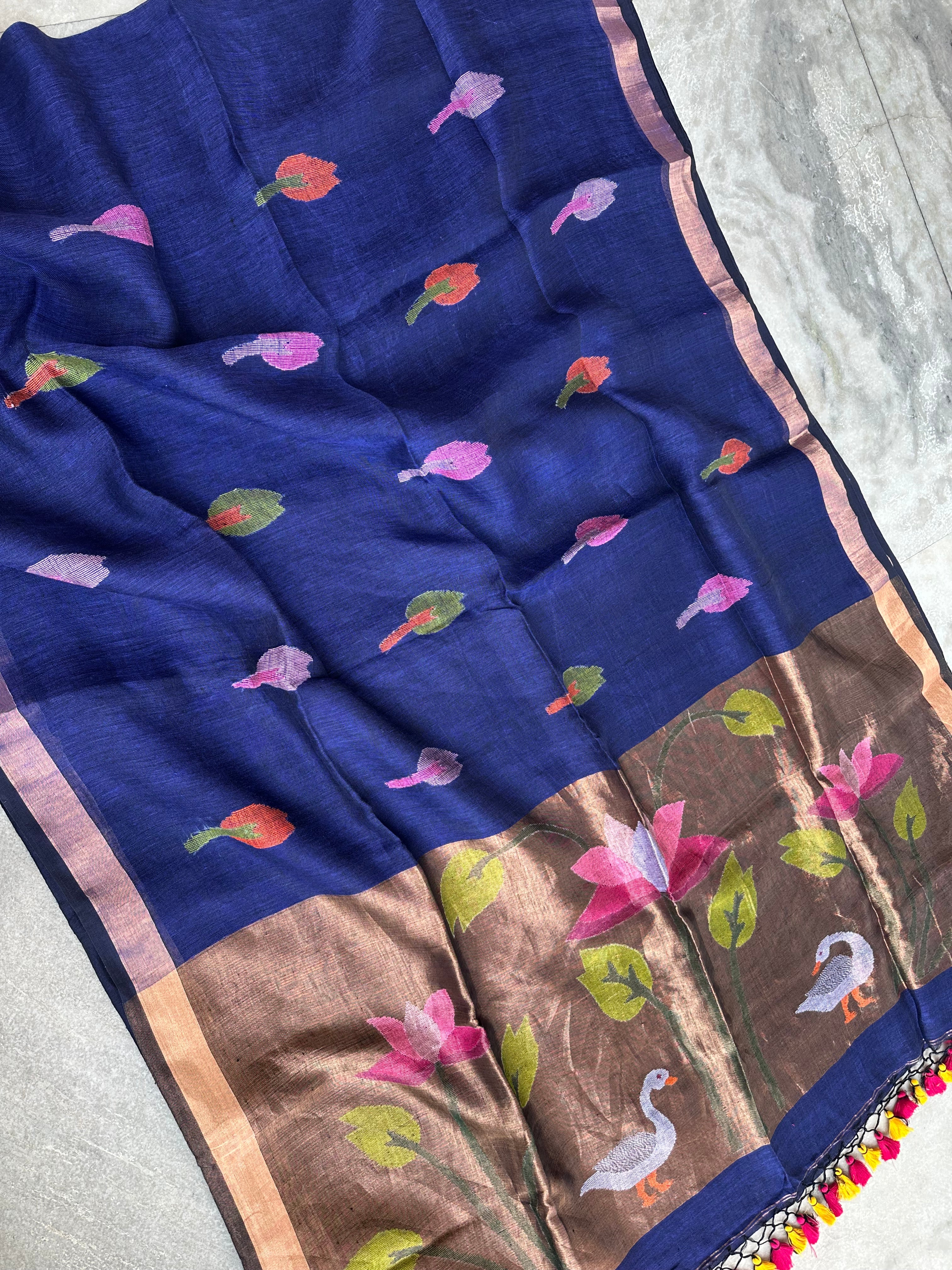 Pure Linen Handloom Paithani Jamdani Navy Blue black Dual Tone Saree