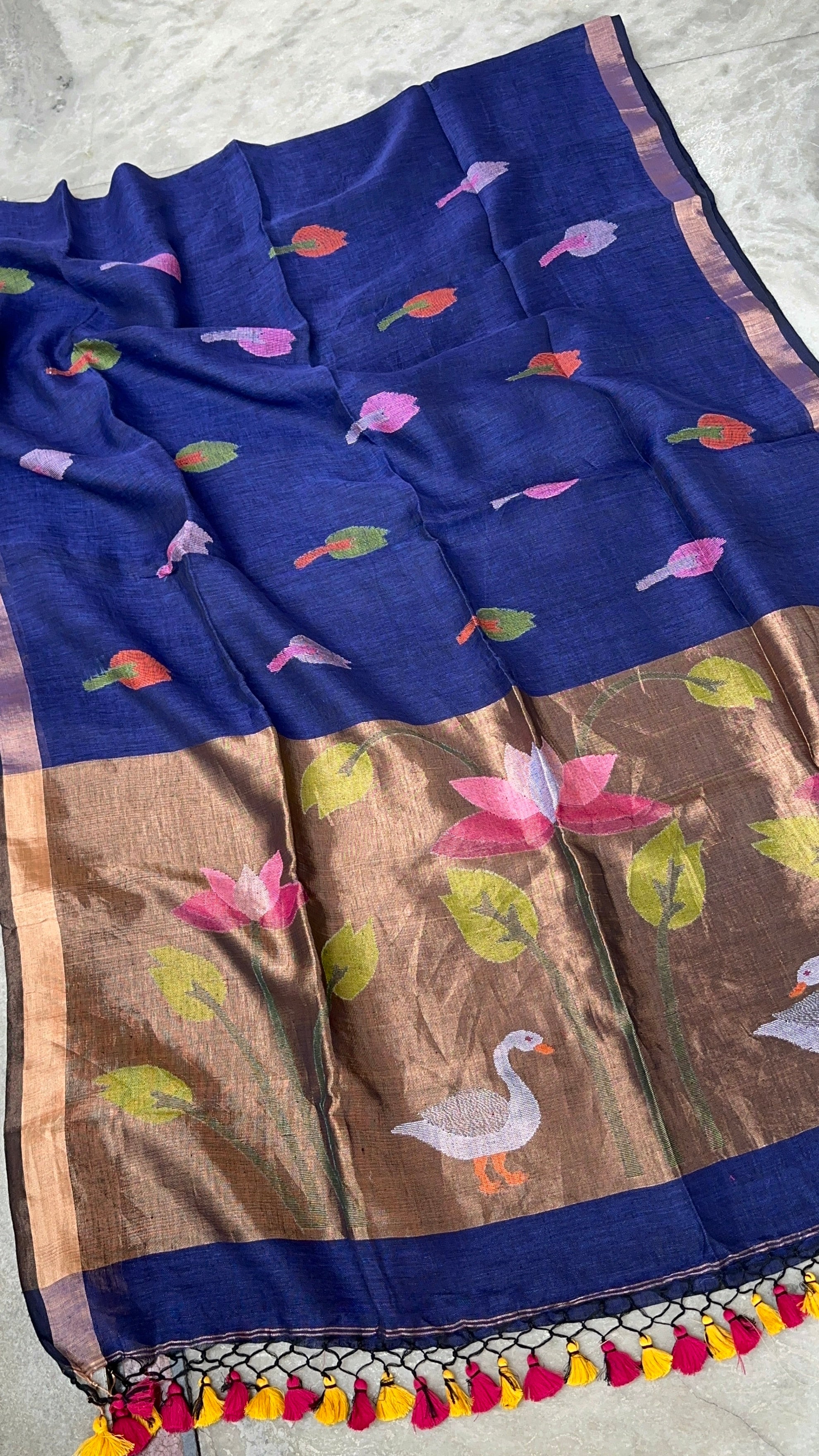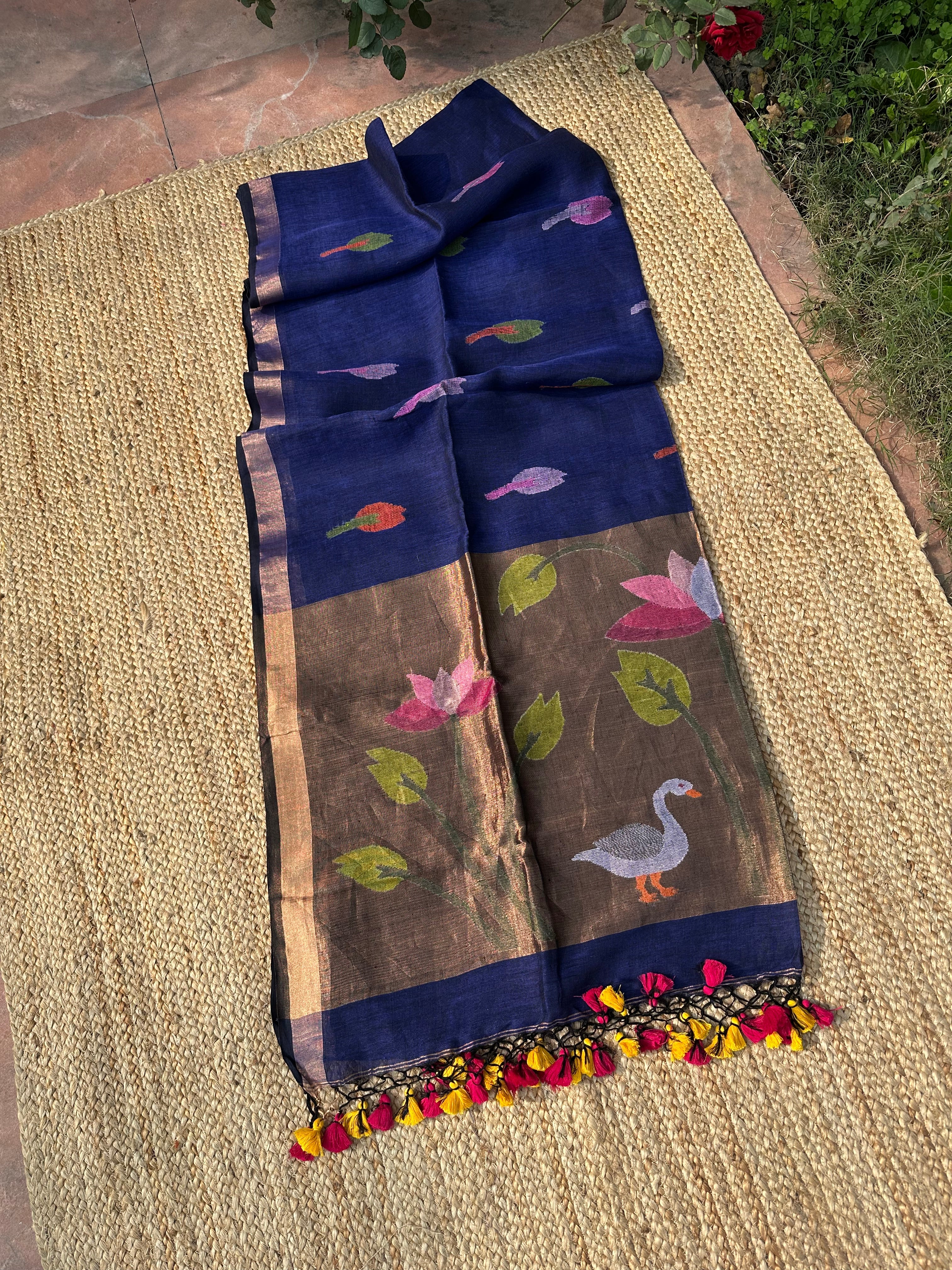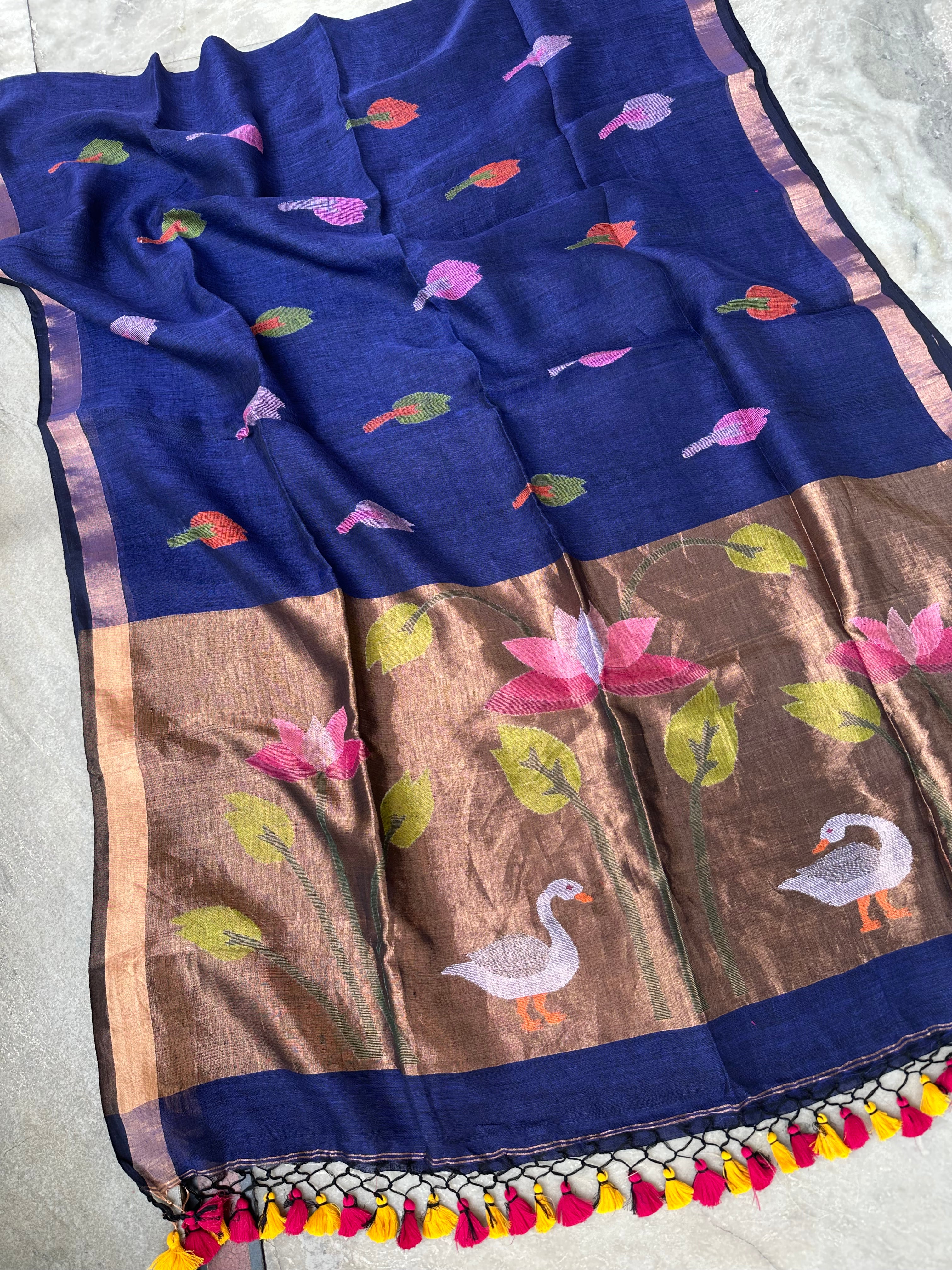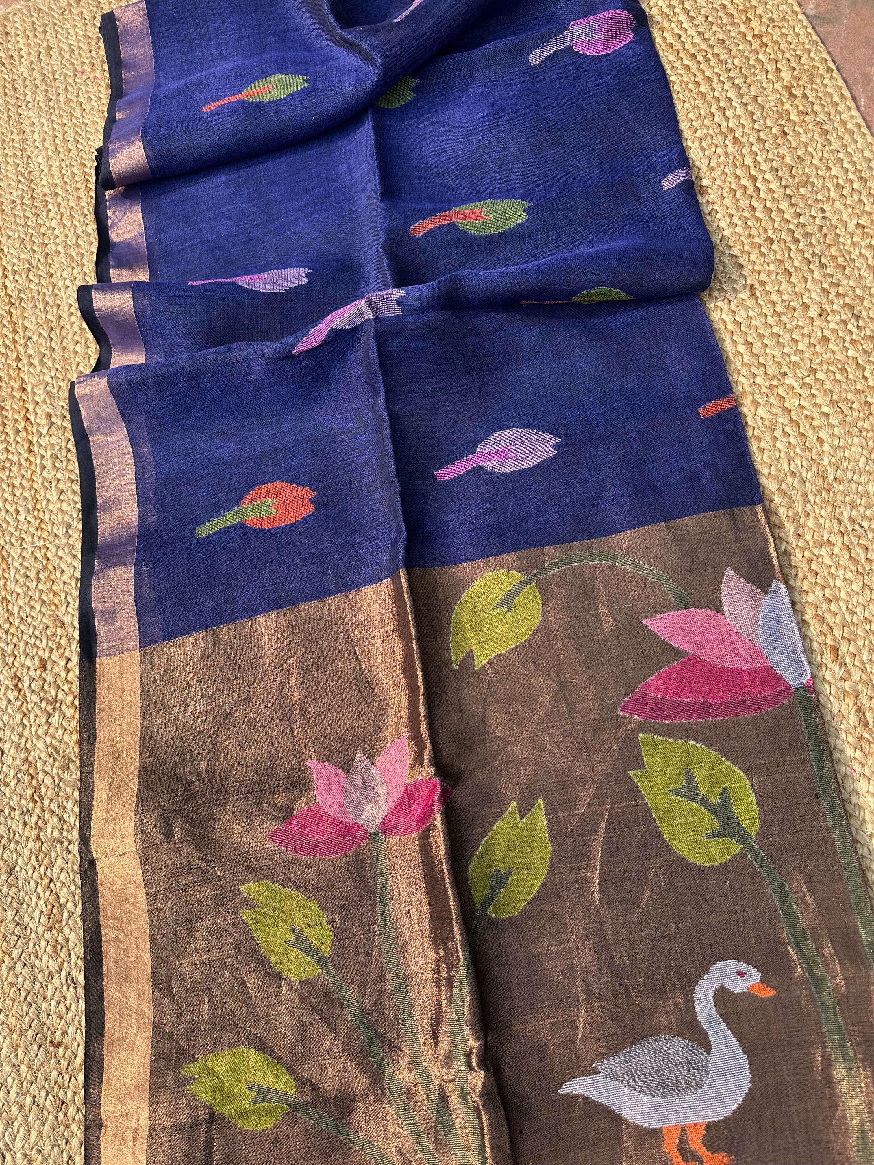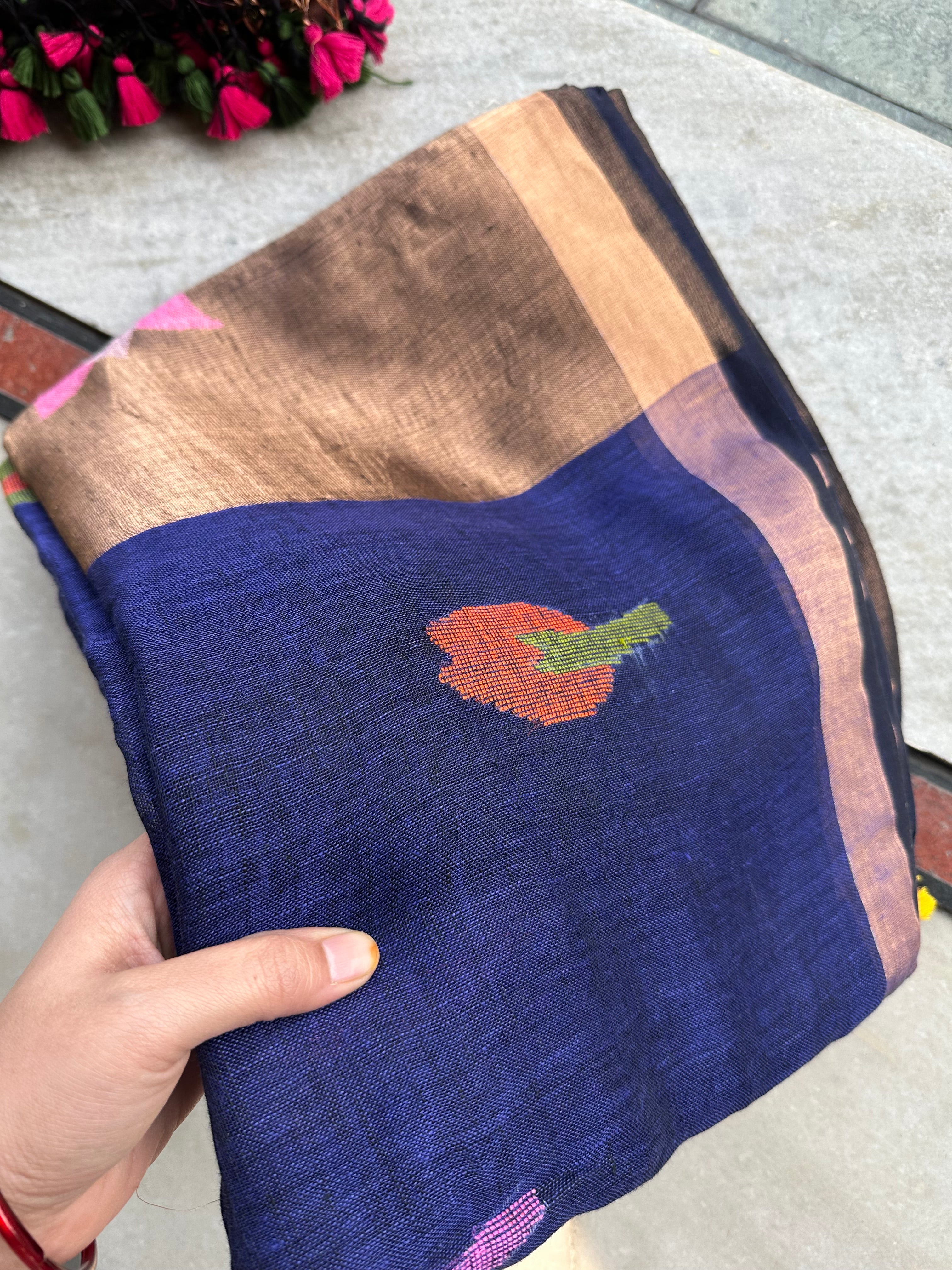 Pure Linen Handloom Paithani Jamdani Navy Blue black Dual Tone Saree