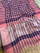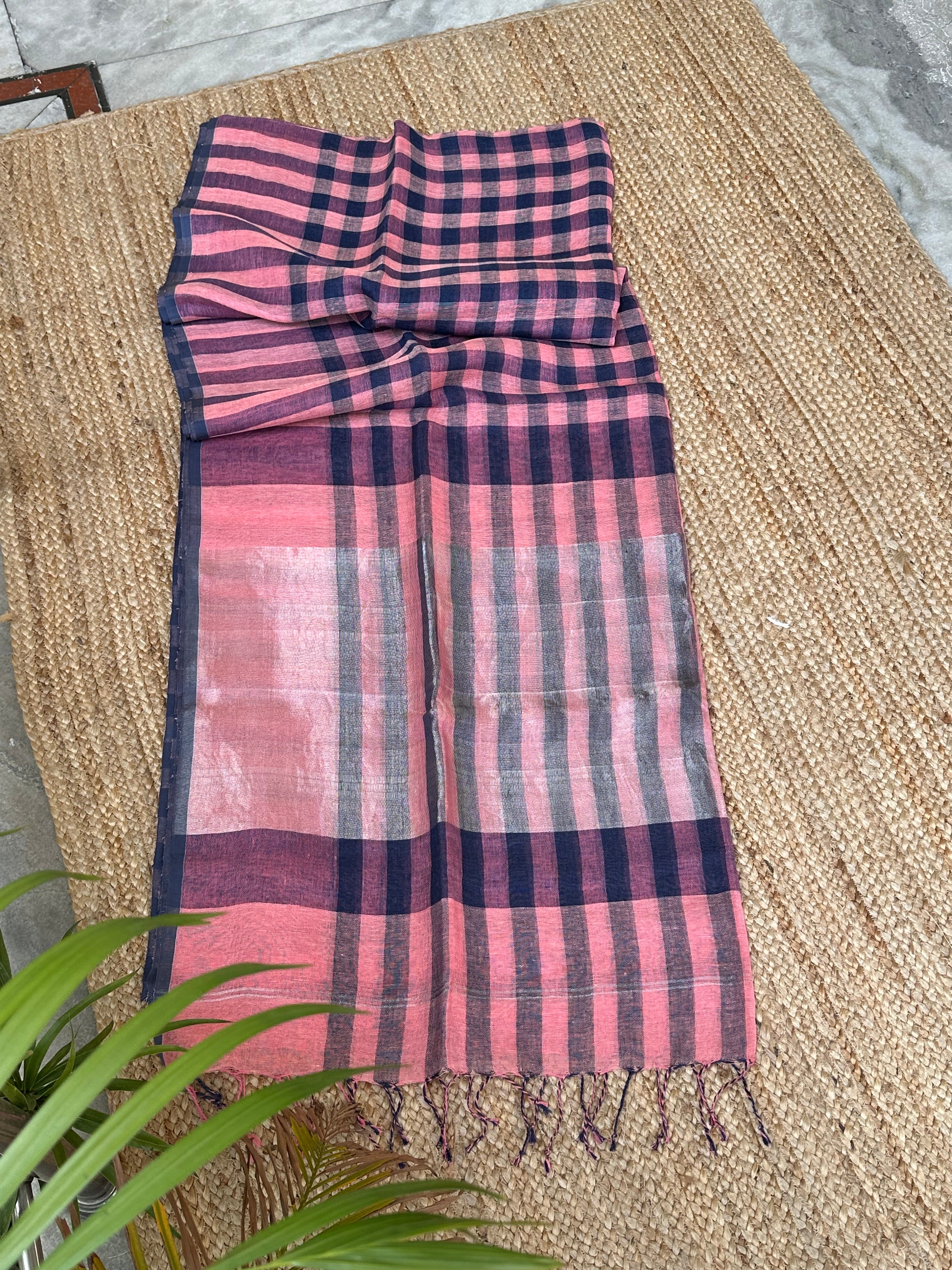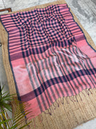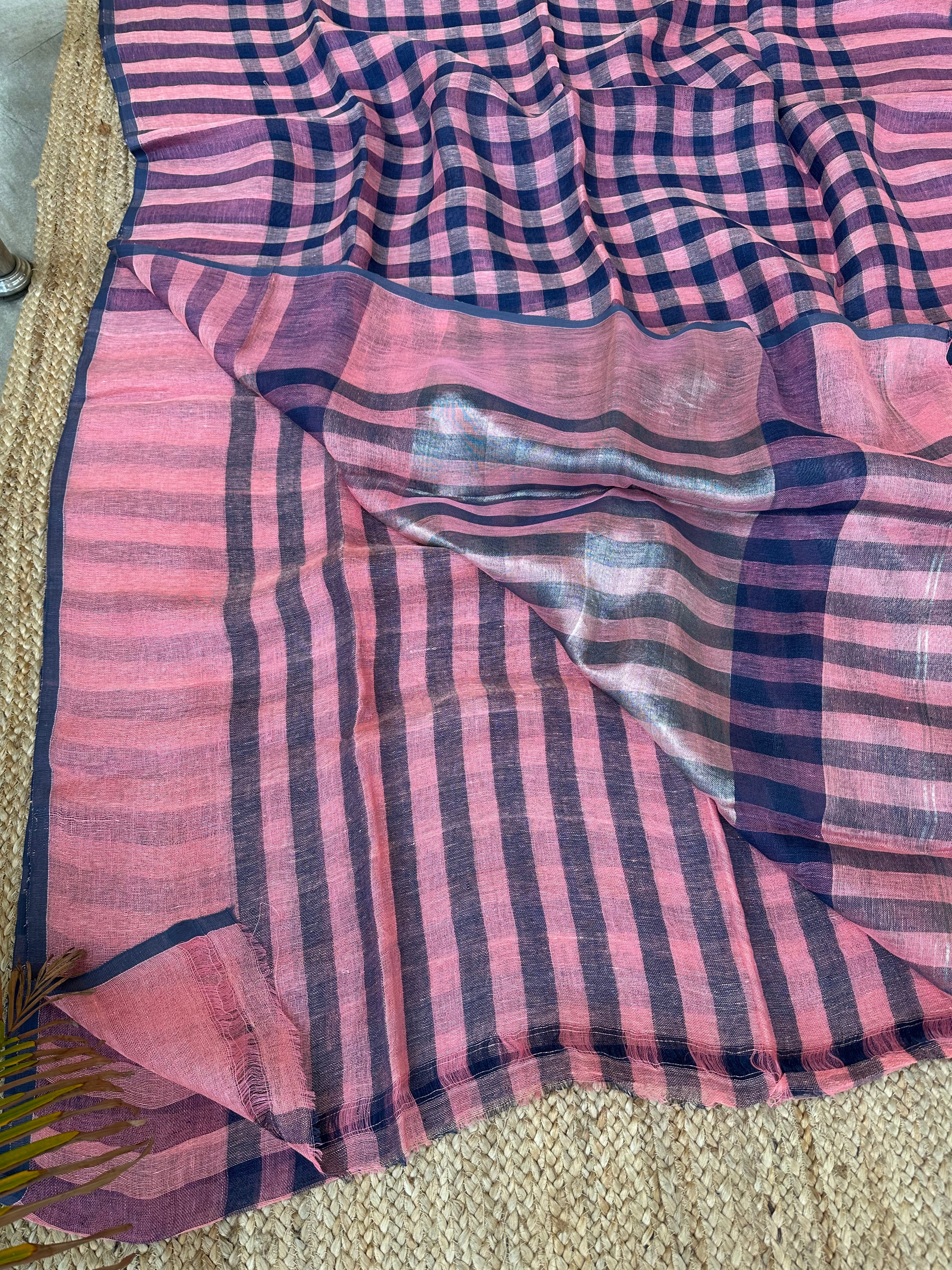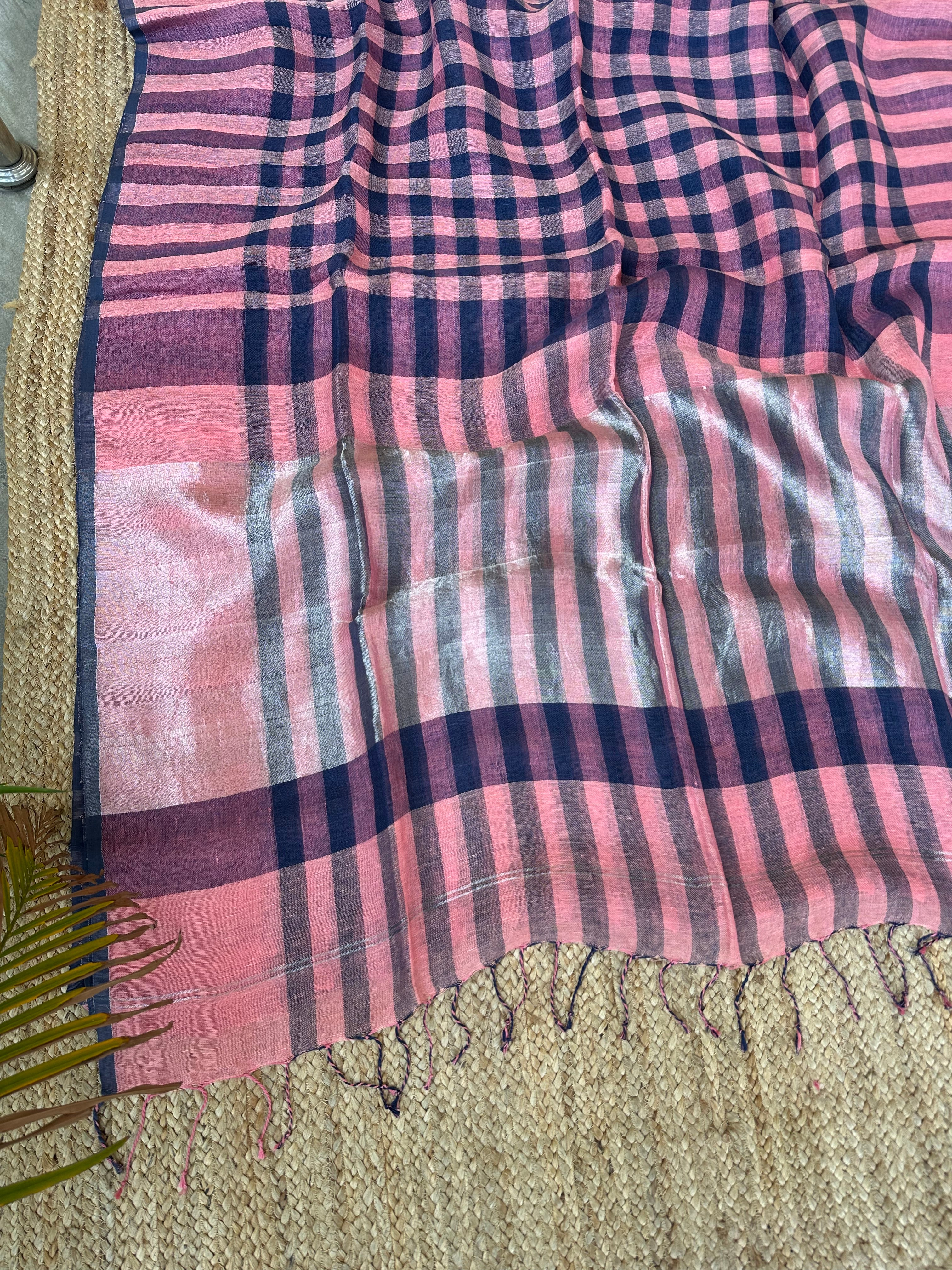 Pure Linen Handloom Pink Navy Blue checks Saree