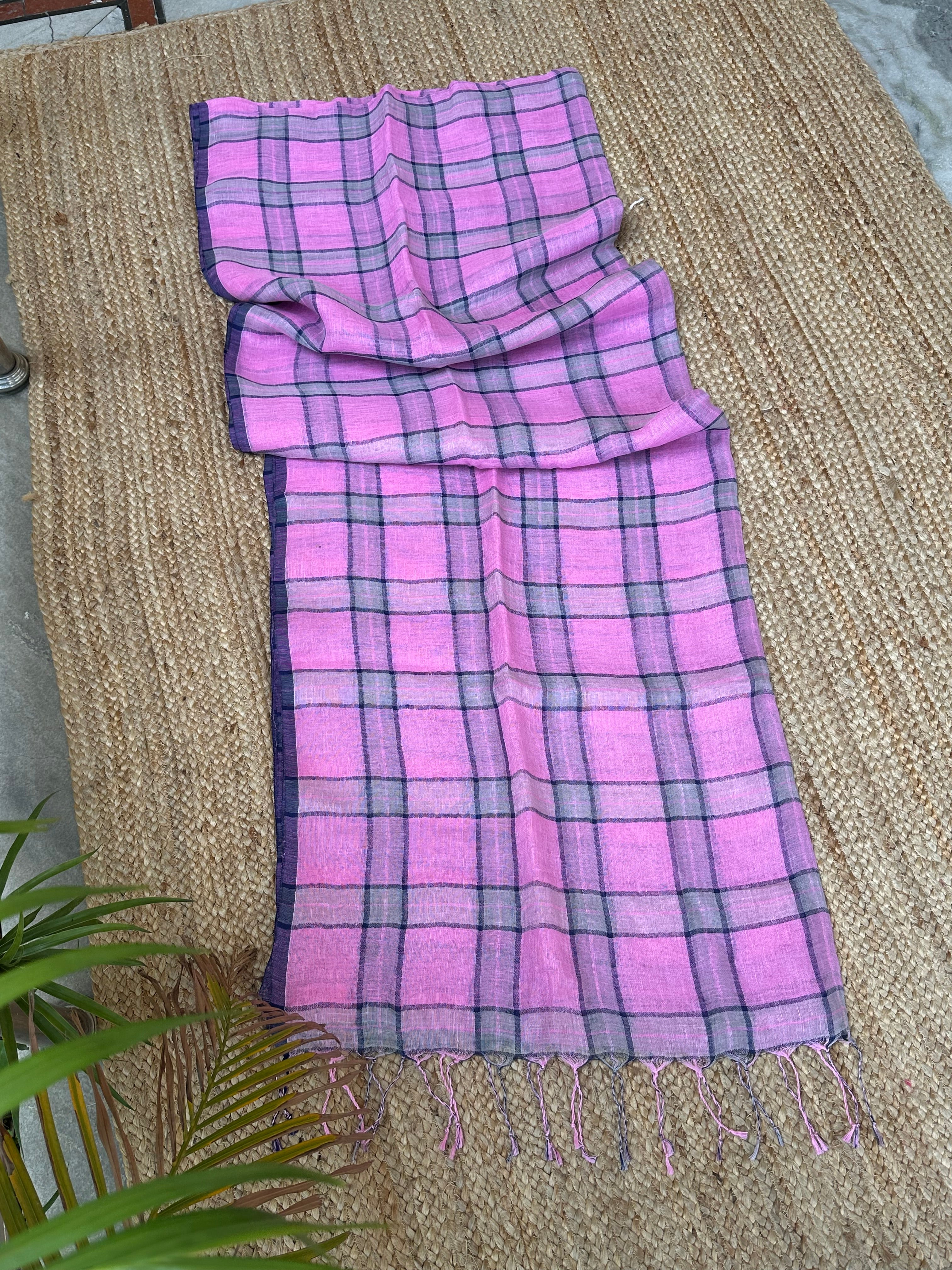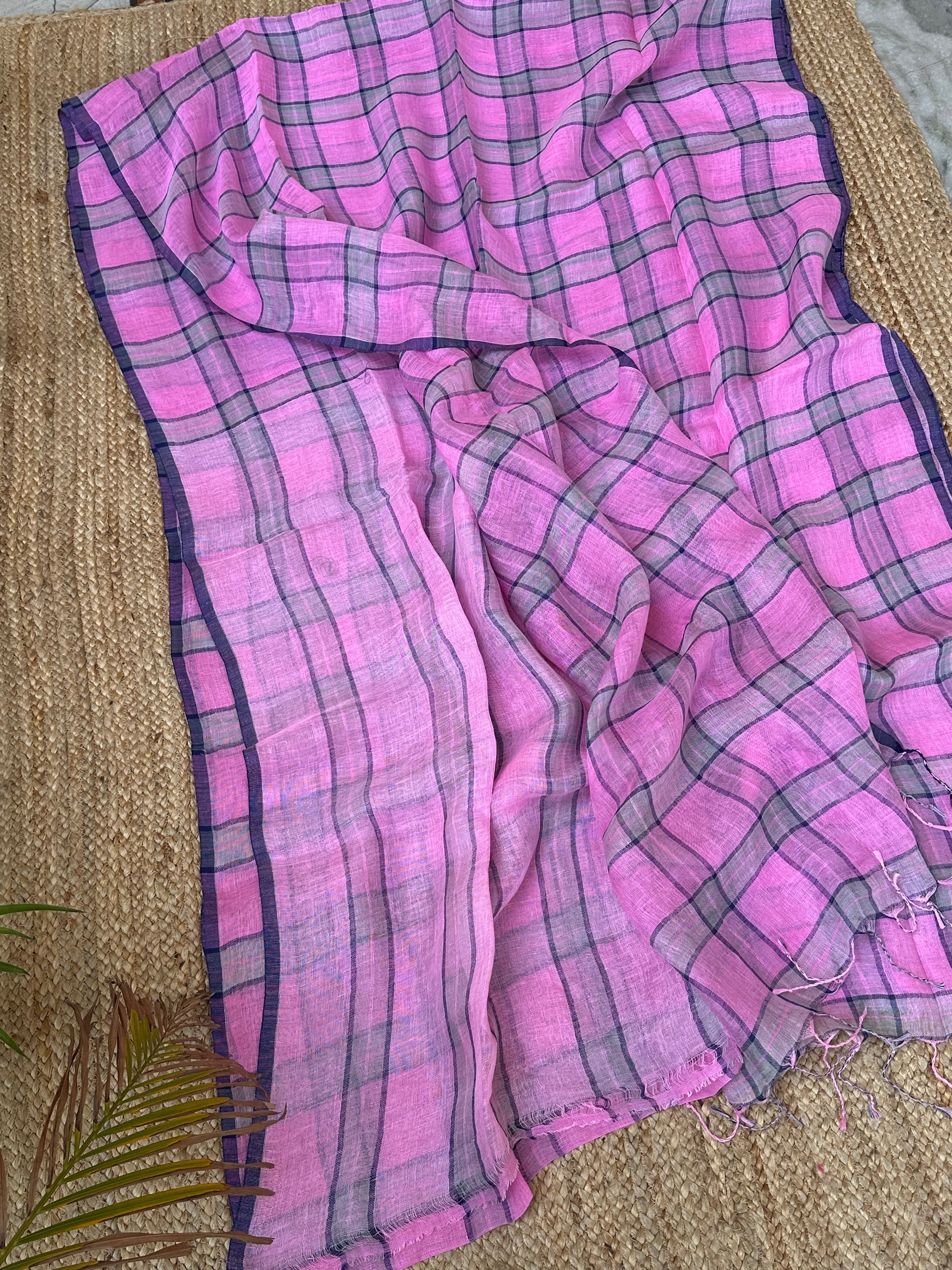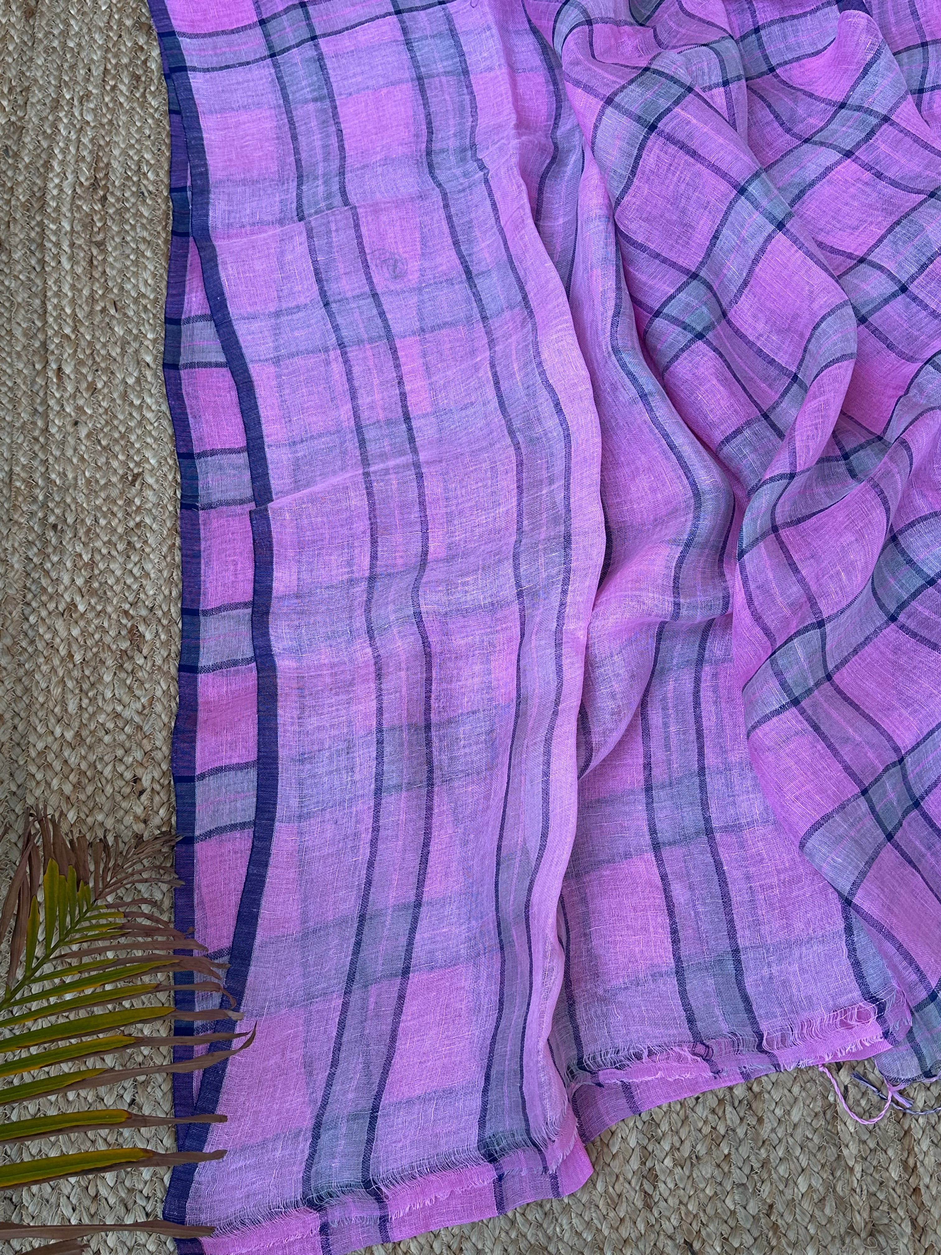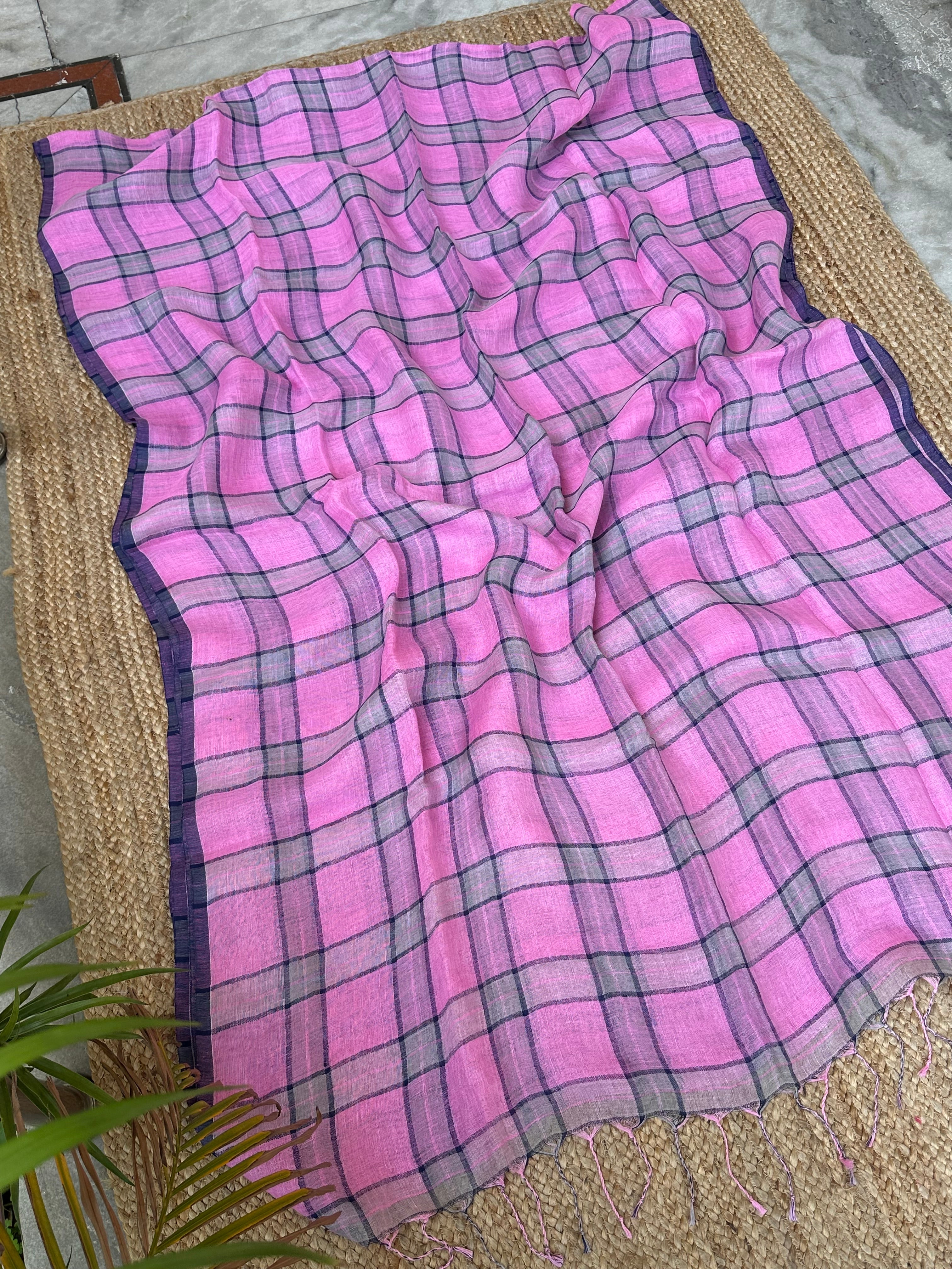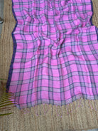 Pure Linen Handloom Pinkish Purple Saree with Blue Checks