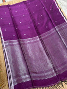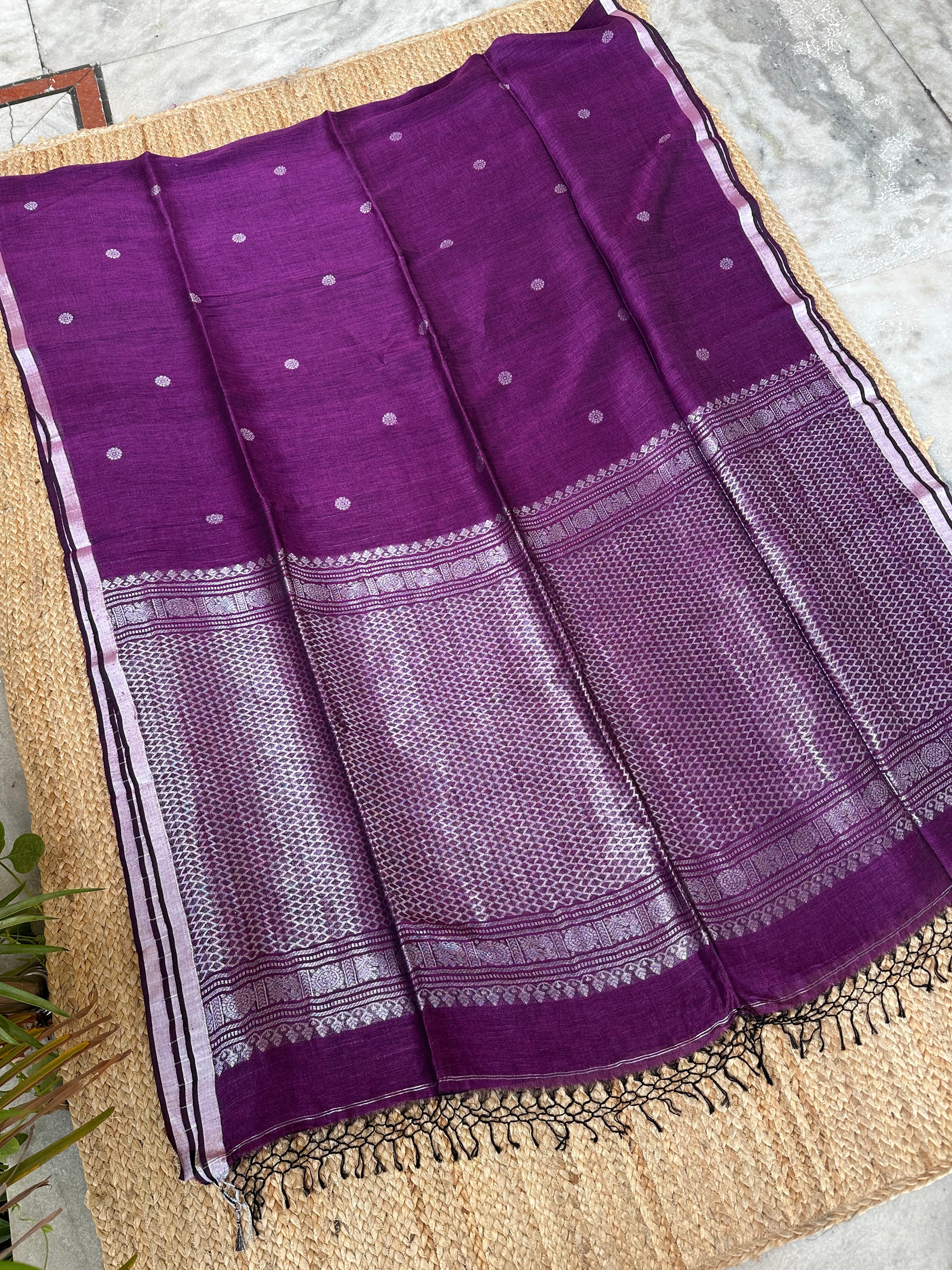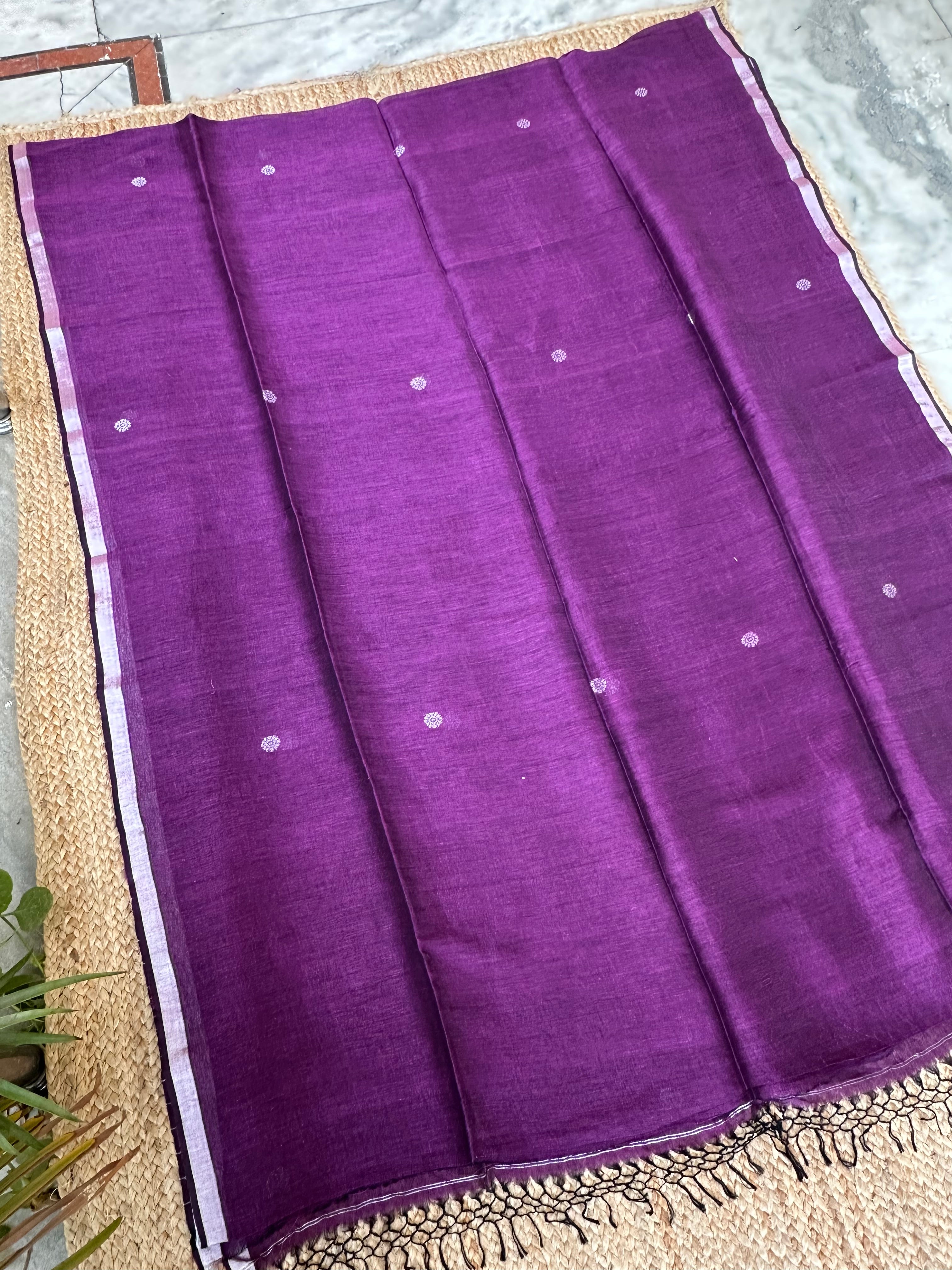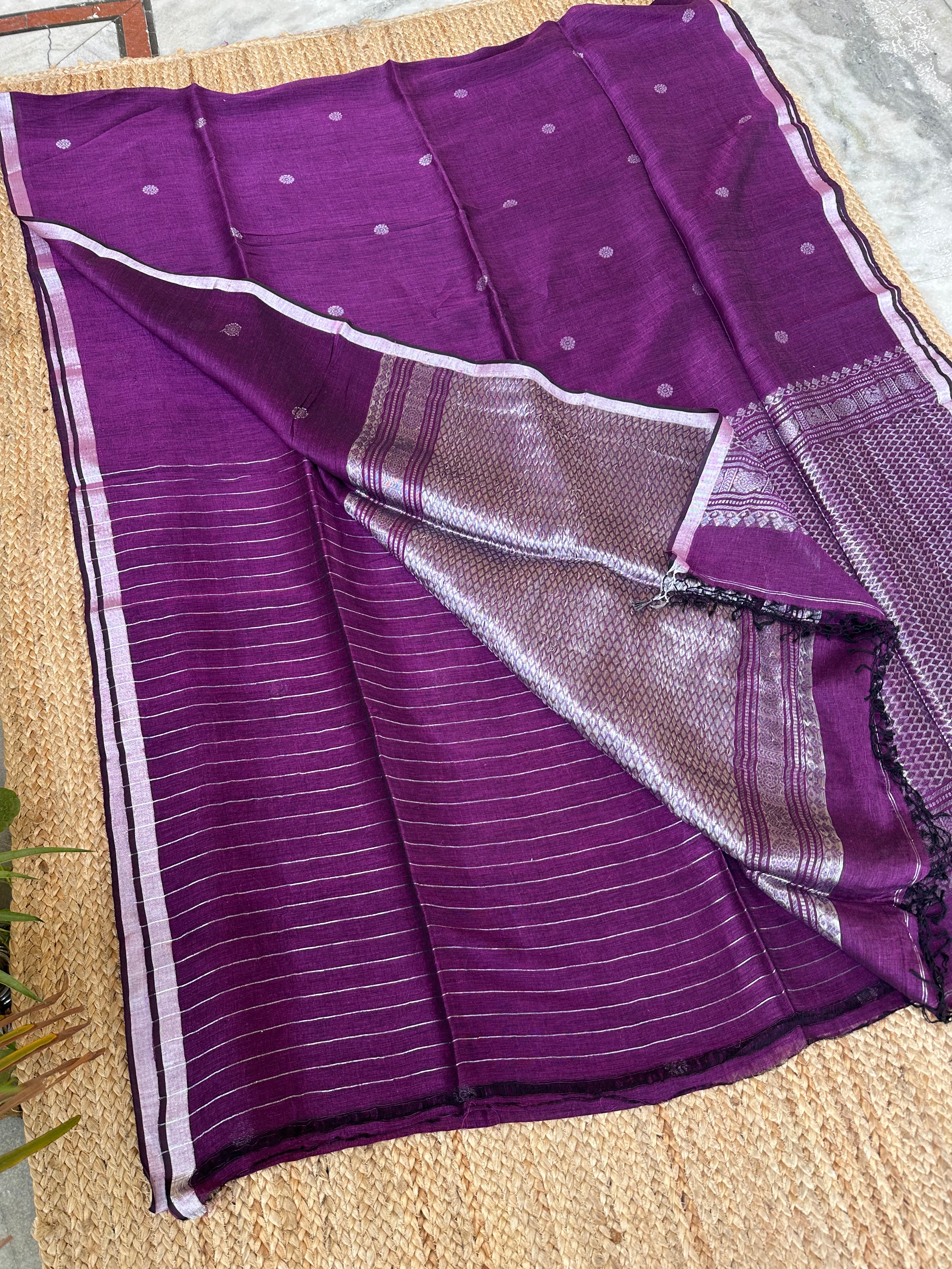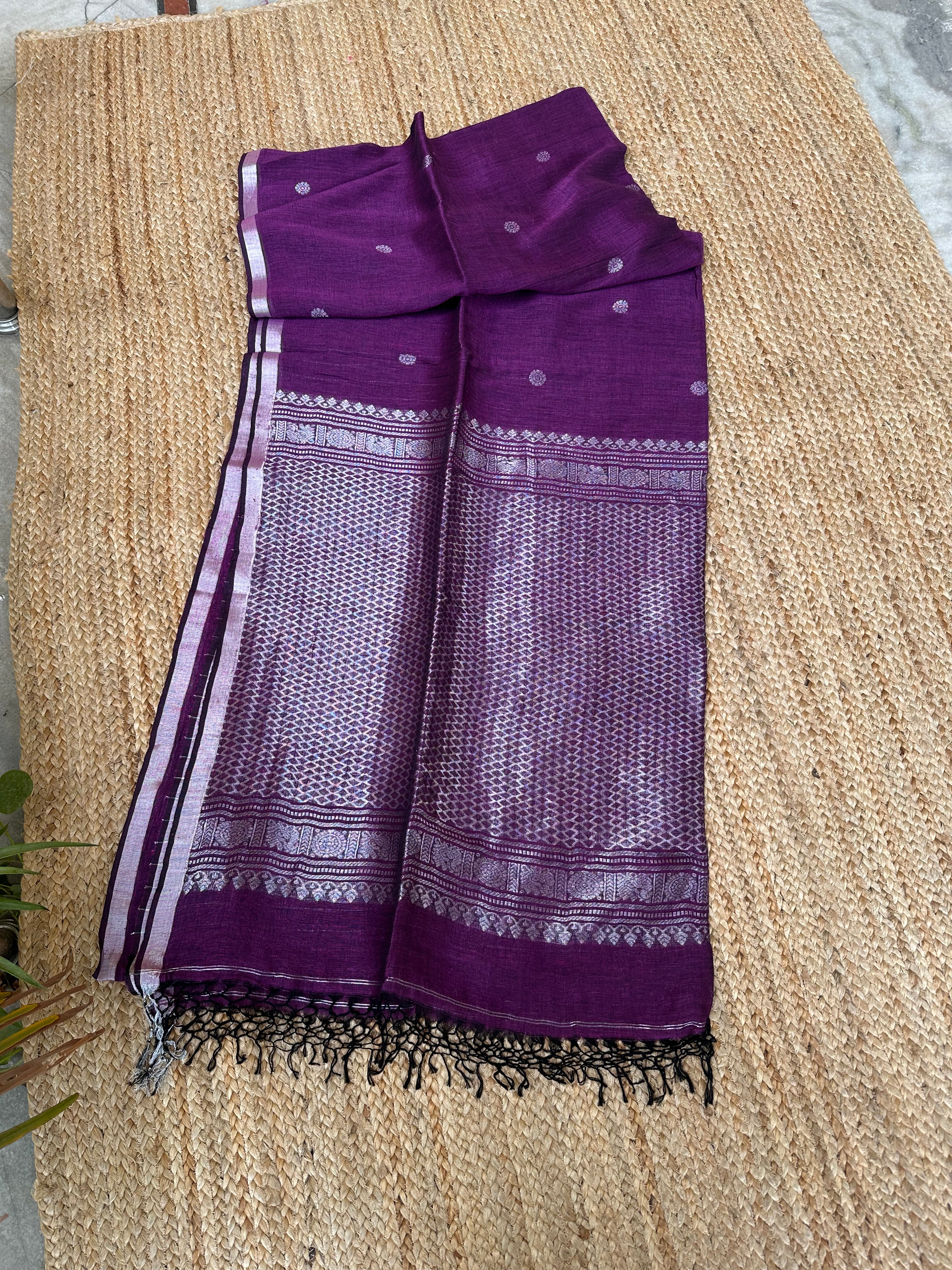 Purple Linen Handloom Silver Zari Saree