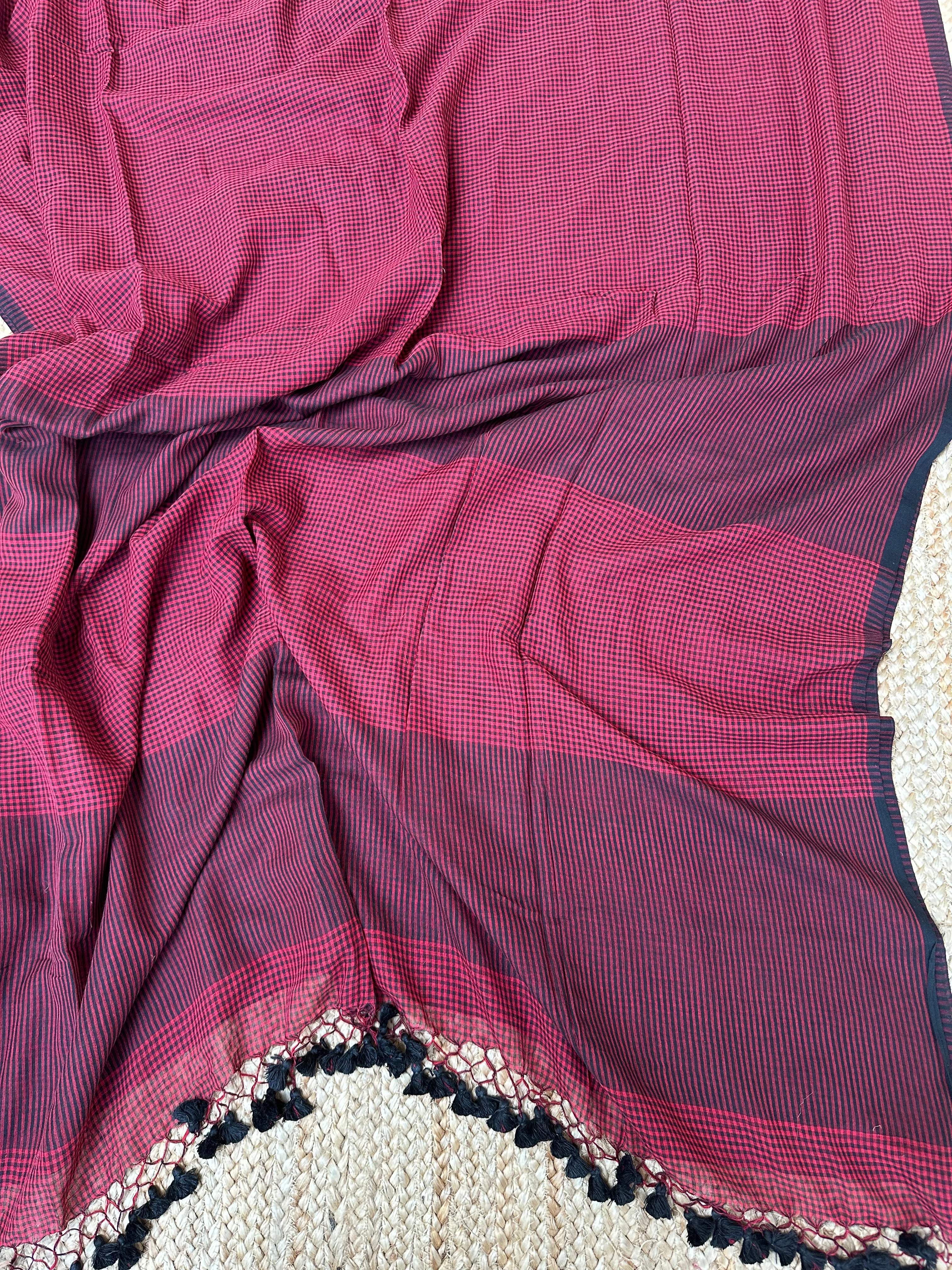 Red Black Small Checks Cotton Handloom Saree
