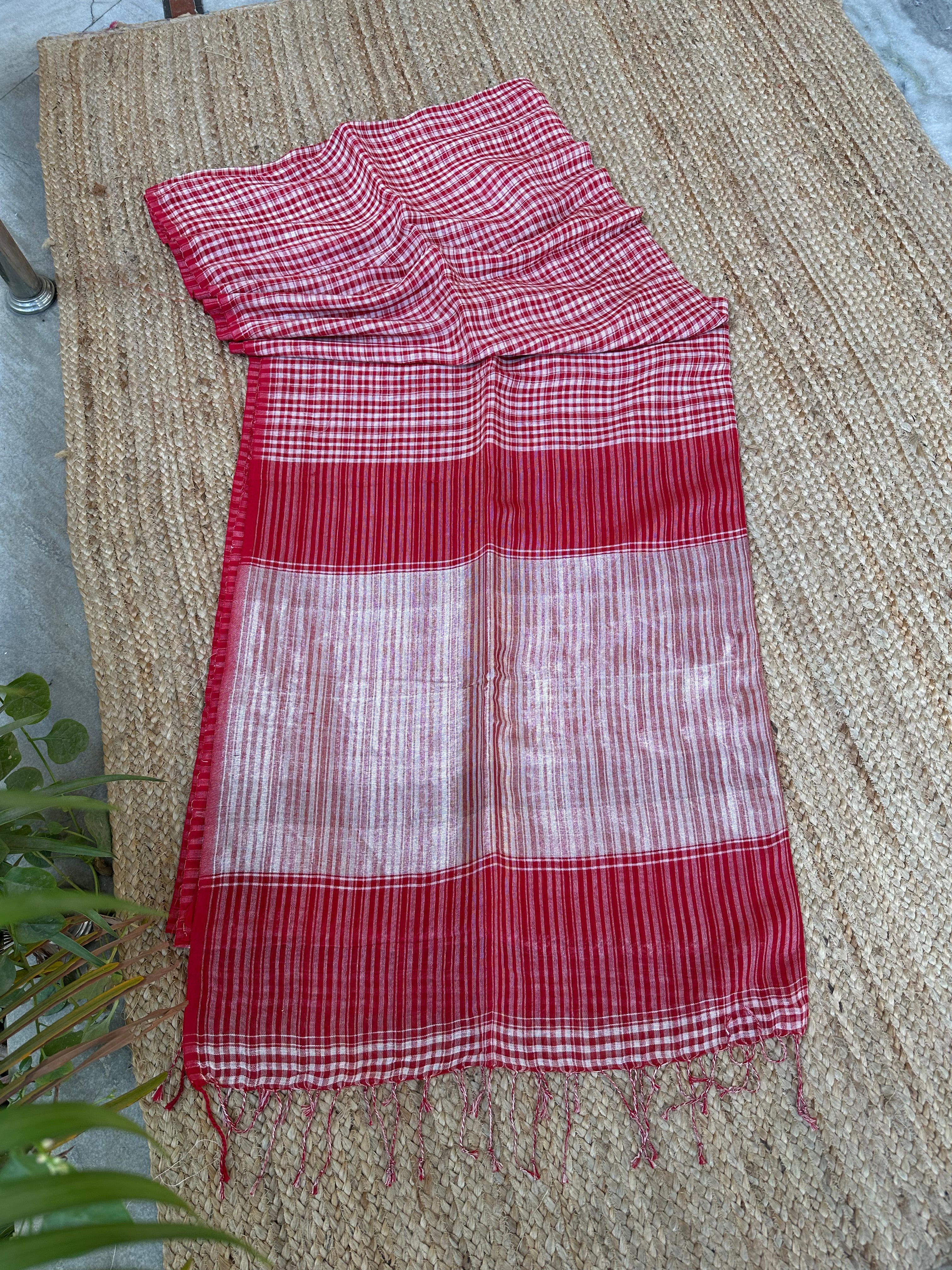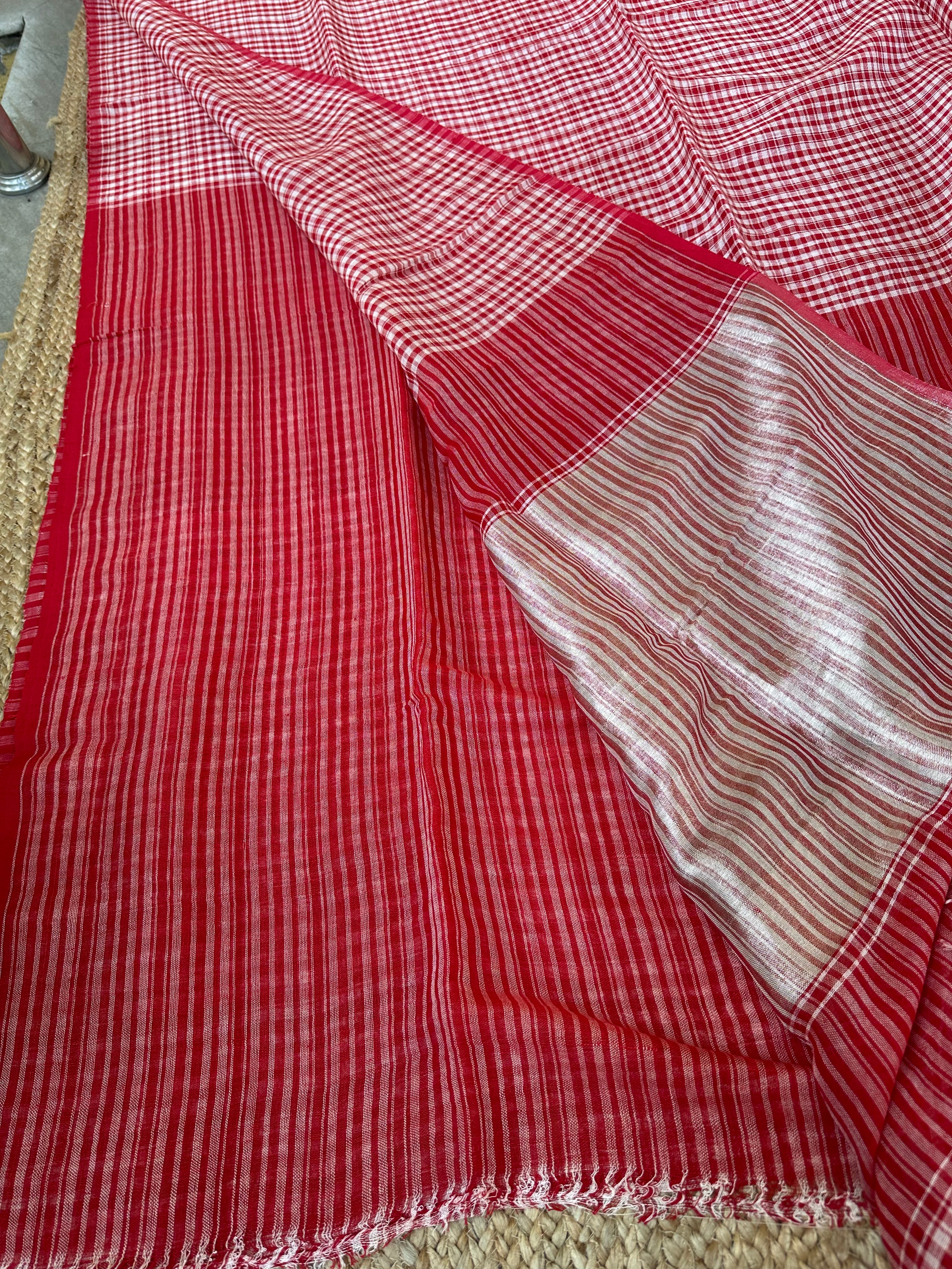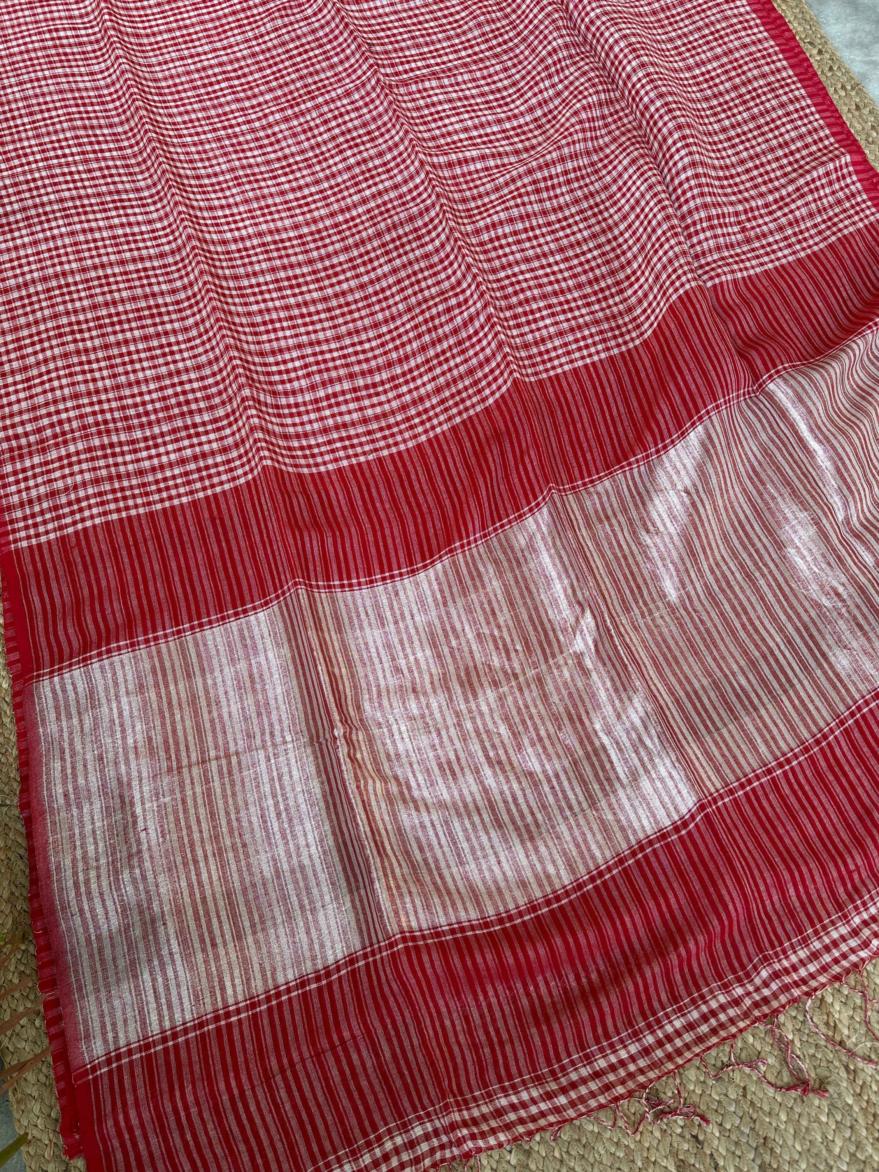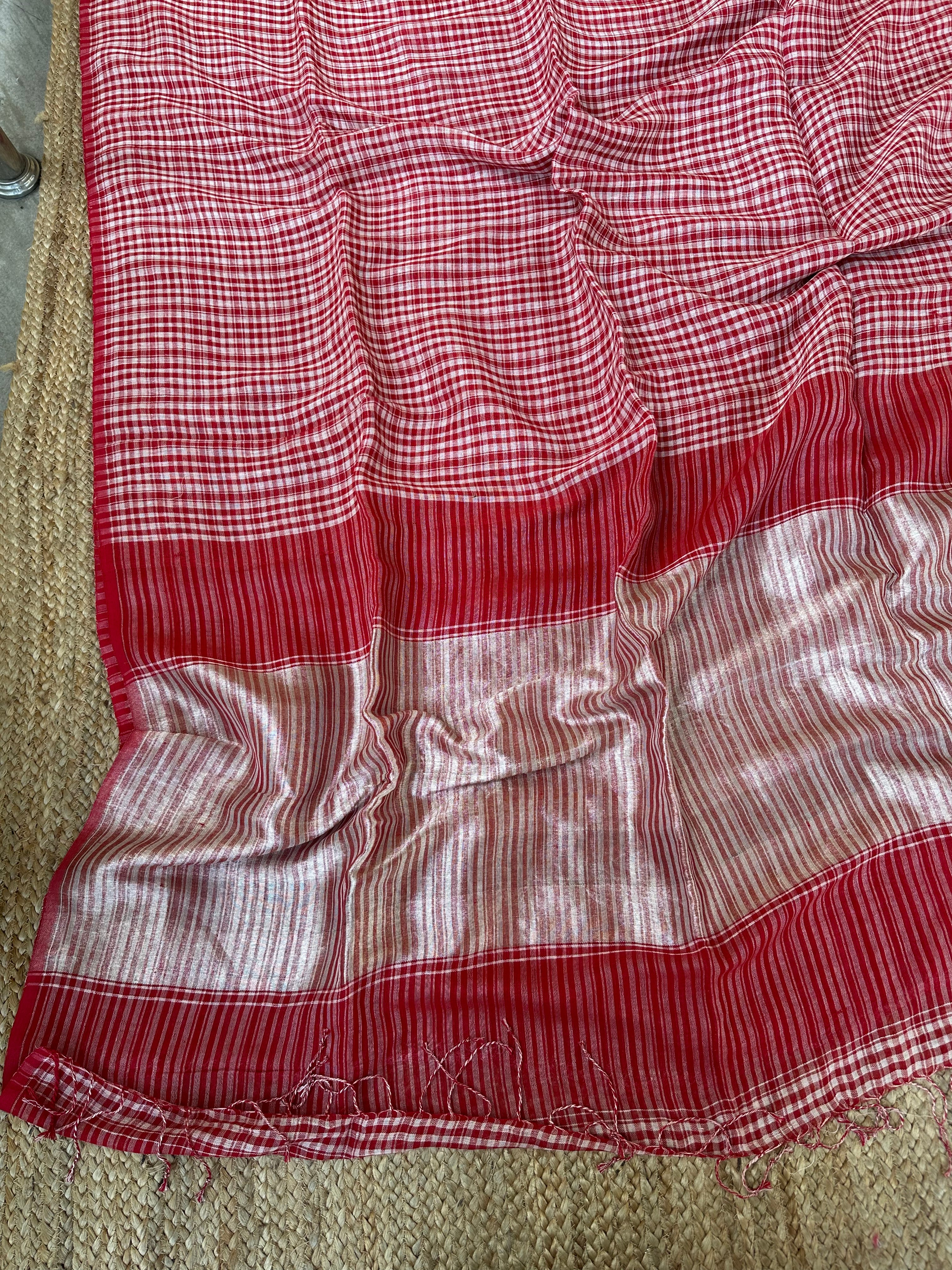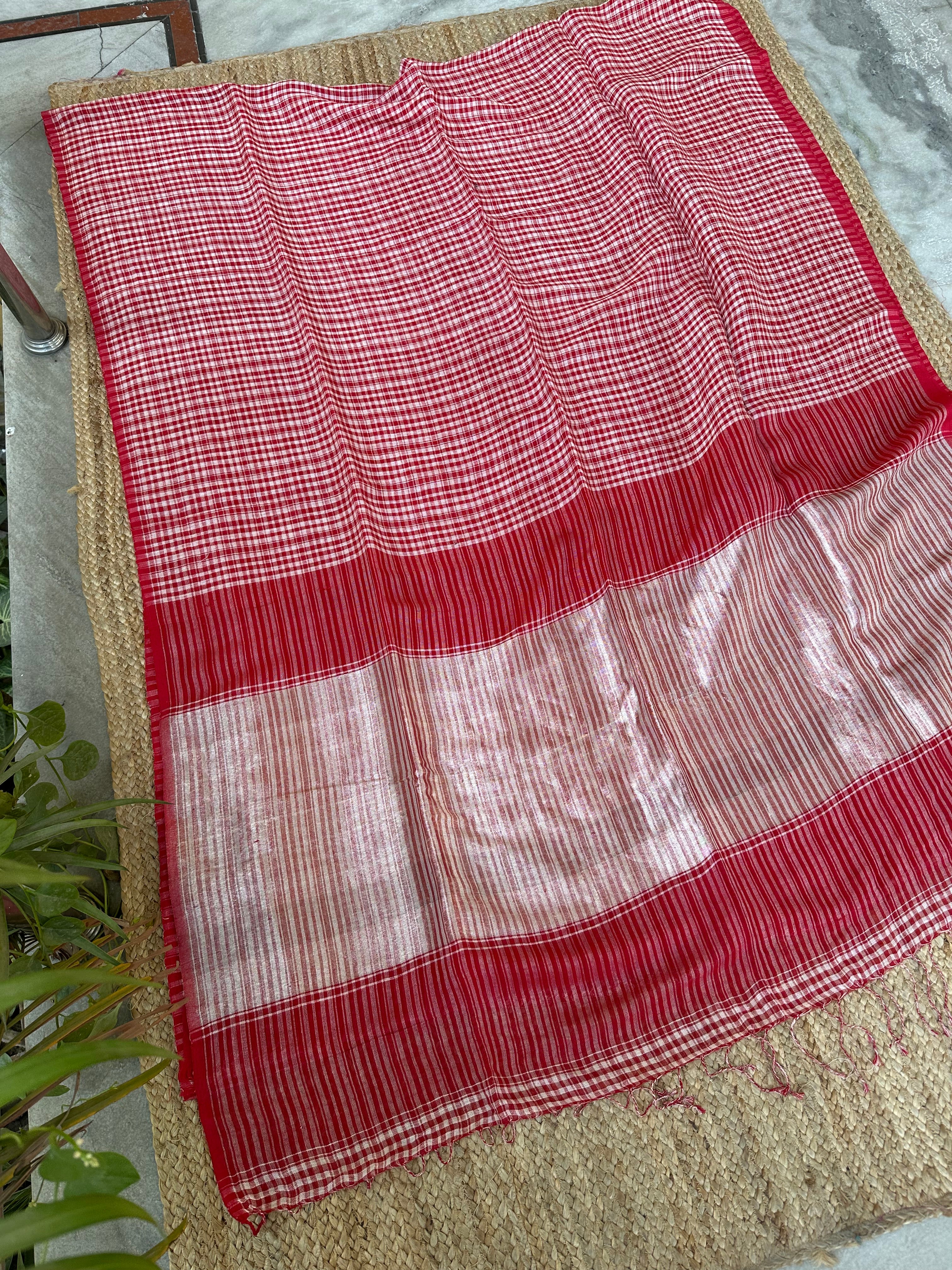 Red Linen Handloom Small Checks Silver Pallu Saree