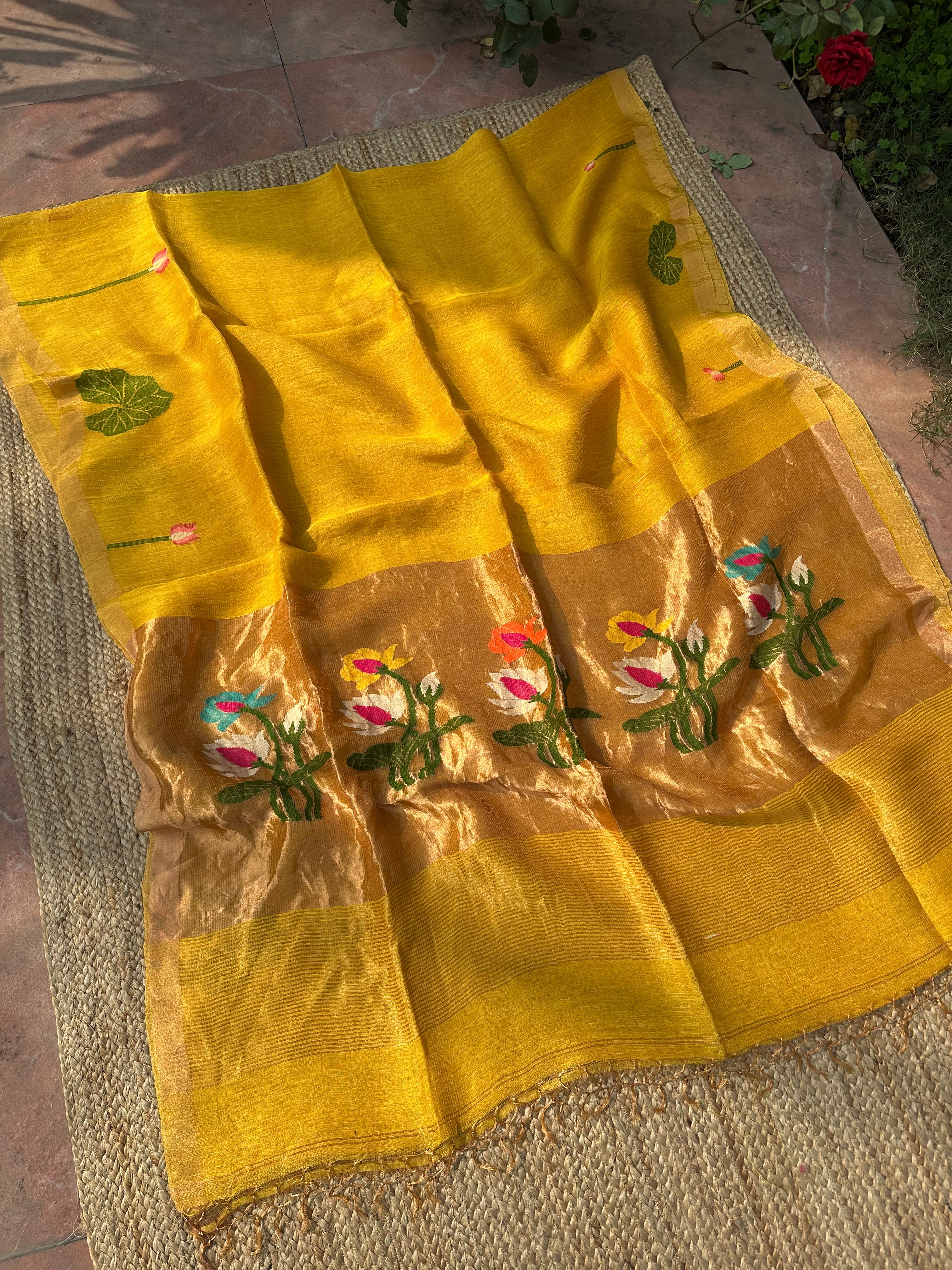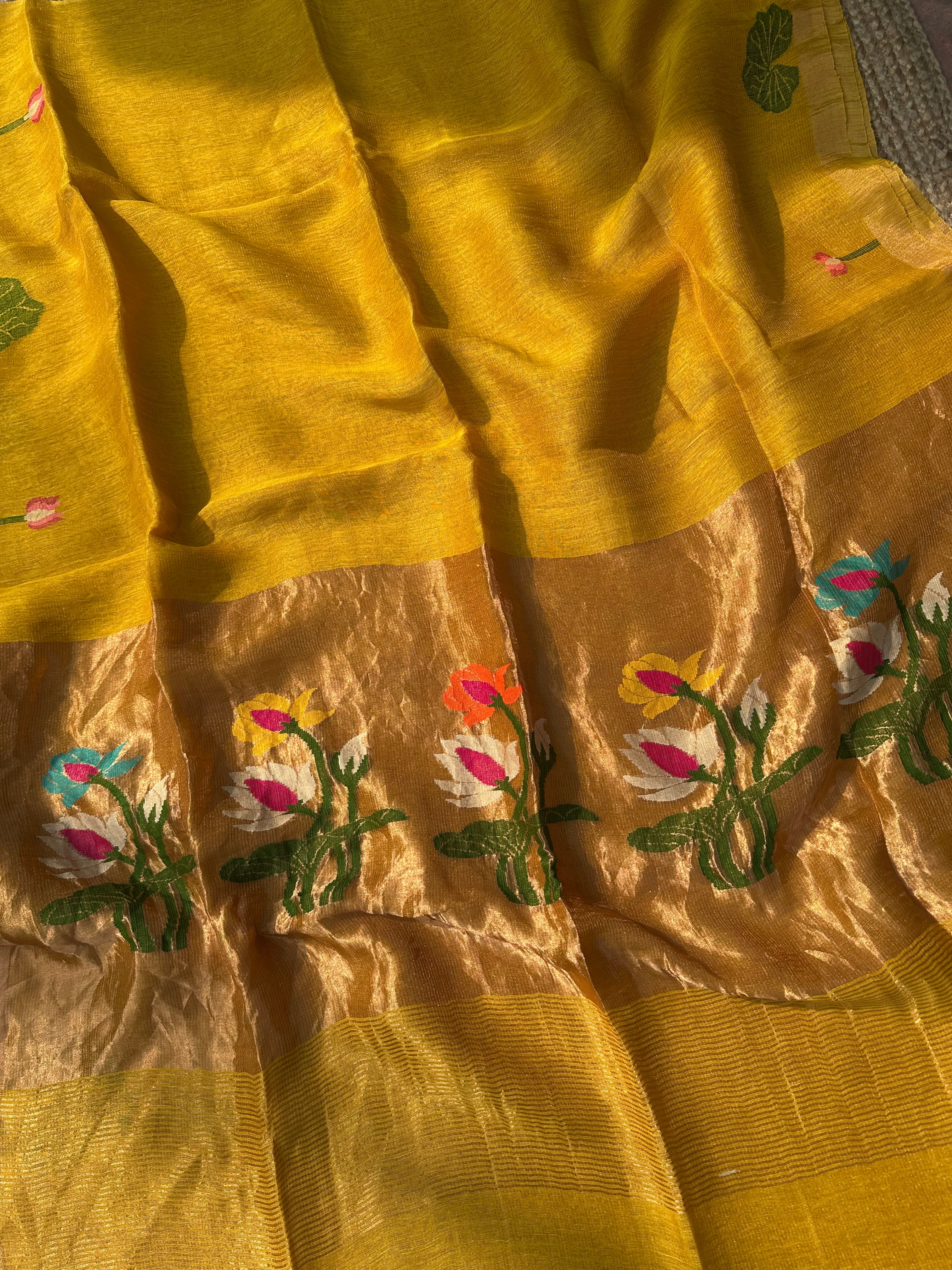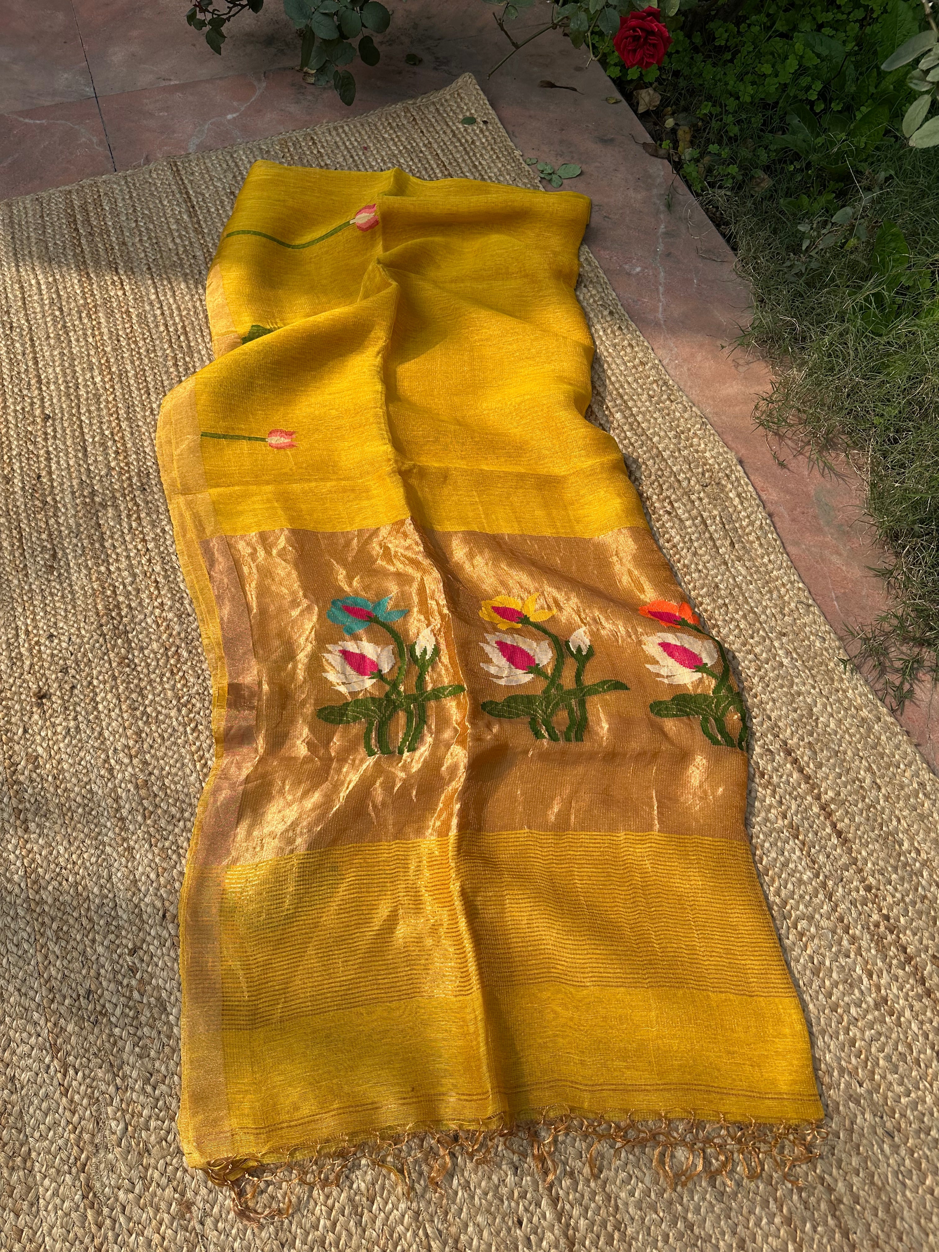Material: Pure Jayshree Linen Silk saree. The warp and weft are of pure linen and pure silk. Premium saree for any occasion. It is handloom sarees with handwoven Jamdani work. The borders have Lotus and leaves handwoven. Pallu has multi colour flowers and zari work. Length of saree is 6.5 mtrs including running blouse.